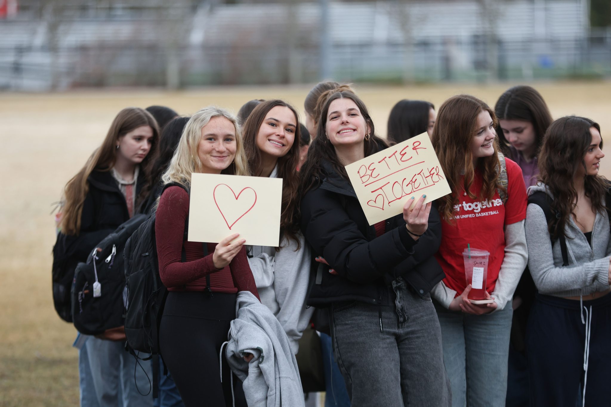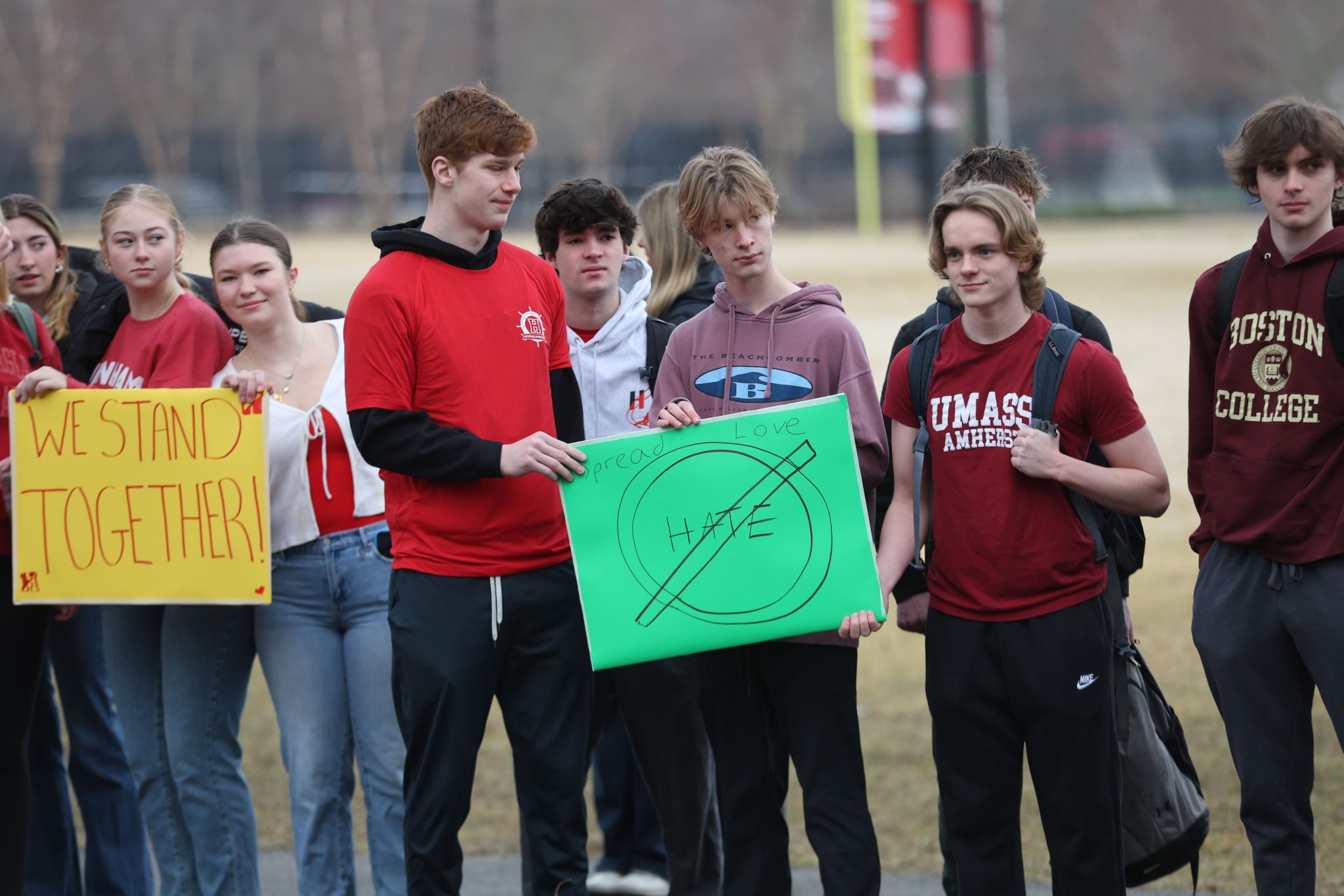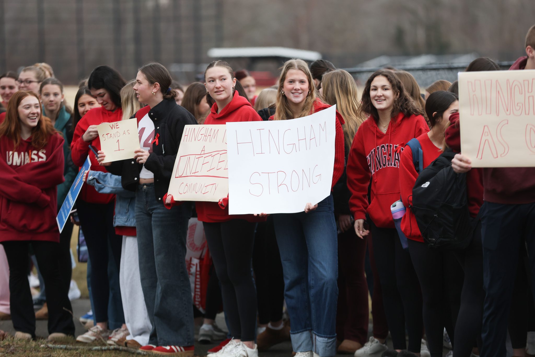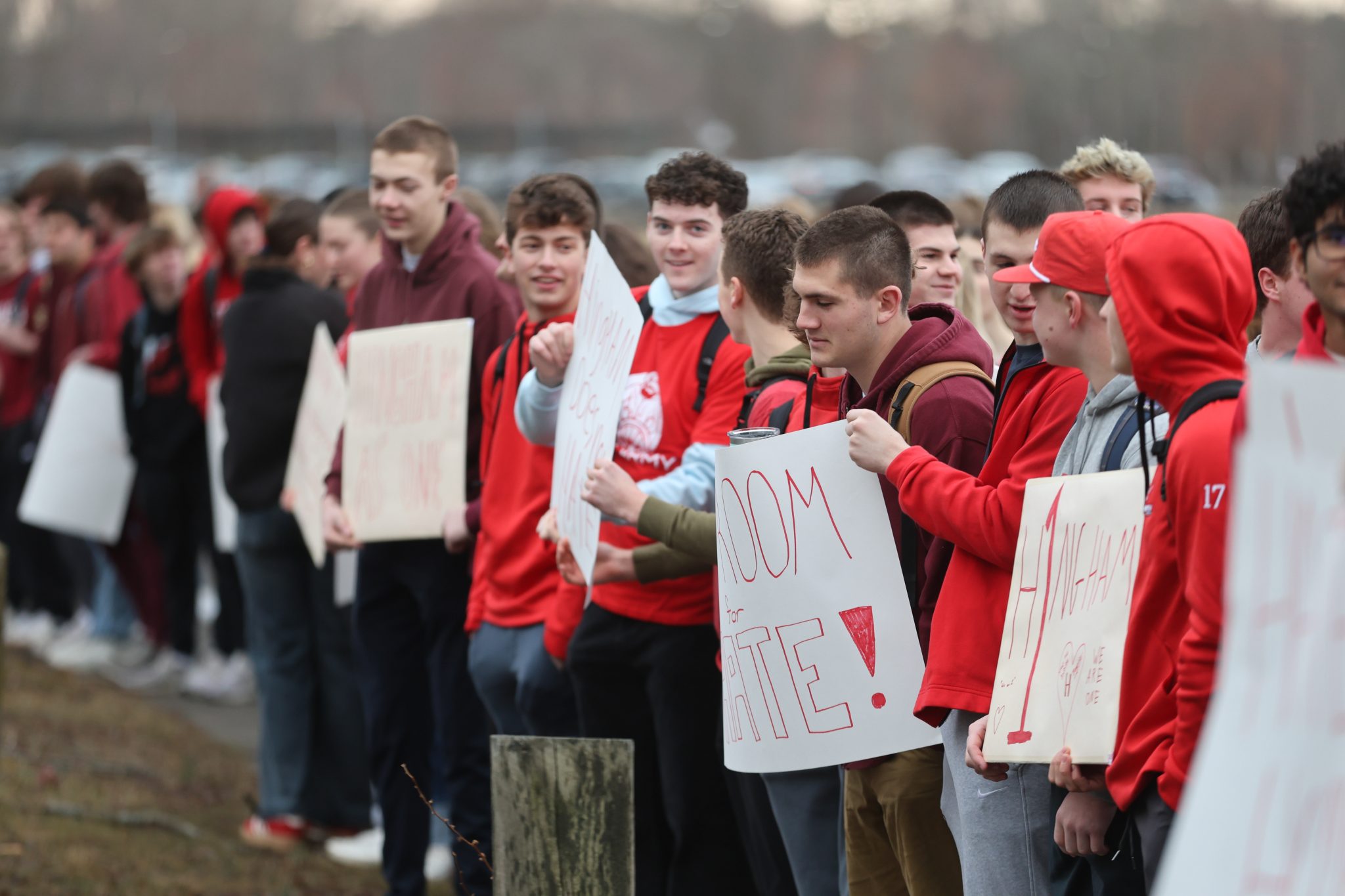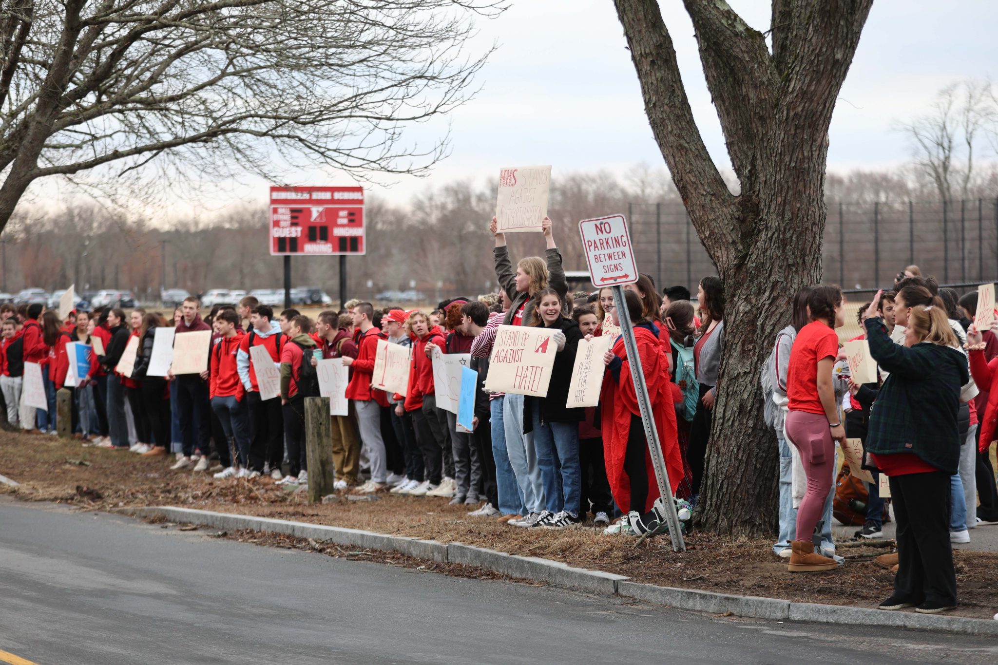 A few hundreds students, teachers, and staff showed up wearing red and hold up handmade signs along Union Street at 7:30 this morning.