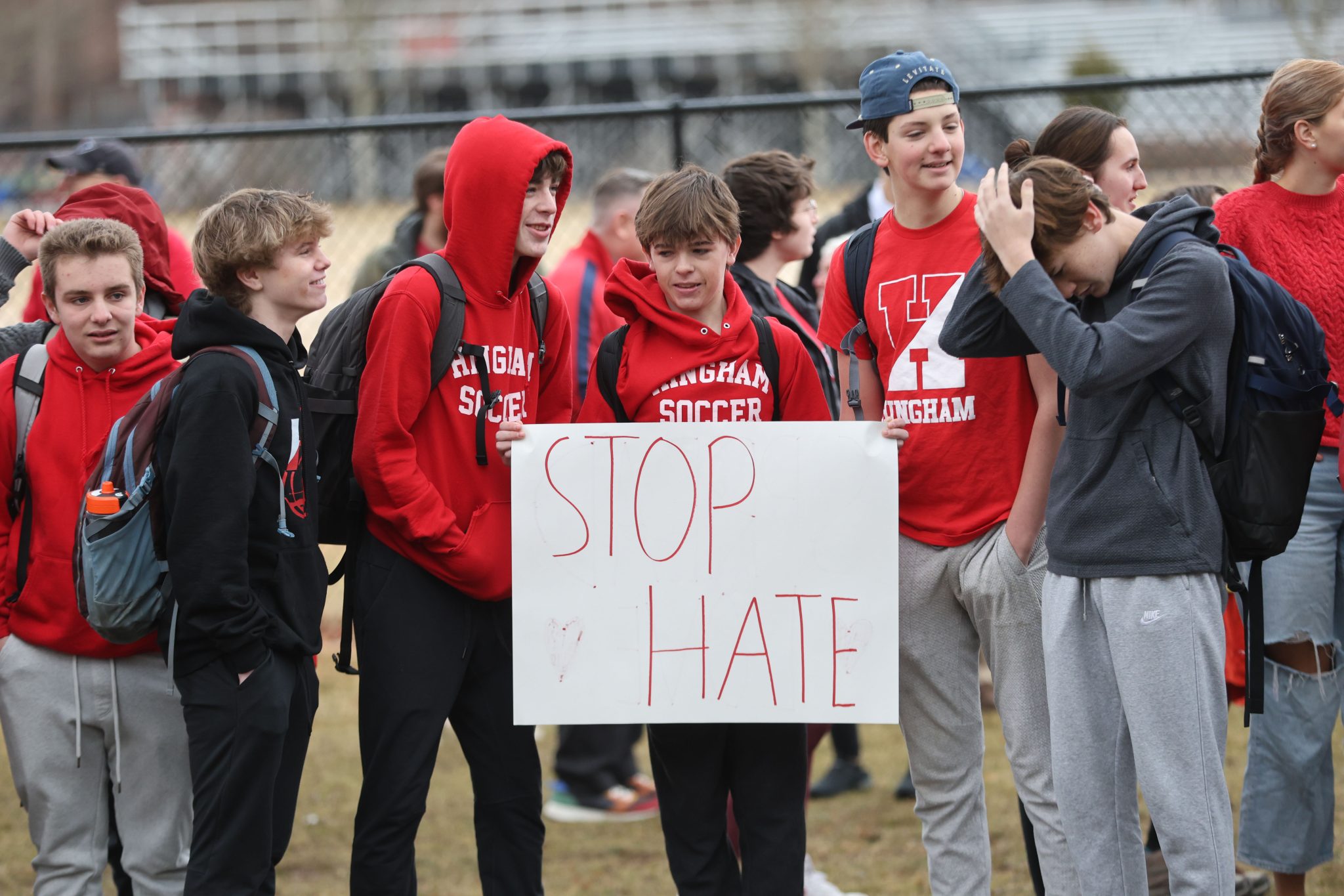 After several occurrences of antisemitic and racist words and drawings appeared in both the boys and girls bathrooms the past week at Hingham High School, members of the Jewish Student Union, People of Color and Allies, and HHS Metco students organized a Unity Rally to show their support of their fellow students and denounce harmful and hateful speech at school. Team captains and the leadership of other HHS clubs and organization helped spread the word about the event.