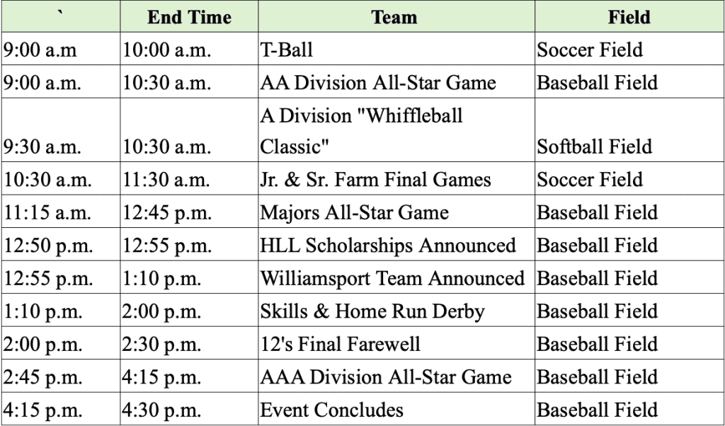 In addition to a fun day of baseball, there will be carnival games, food, a bounce house, a dunk tank, our AA, AAA, and Majors All-Star Games, Skills Competition & Home Run Derby. We’ll also celebrate the 12-year old’s final season, the HLL High School Scholarship Award recipients, local leaders, and Hingham’s 2024 Williamsport Team for the Little League World Series.