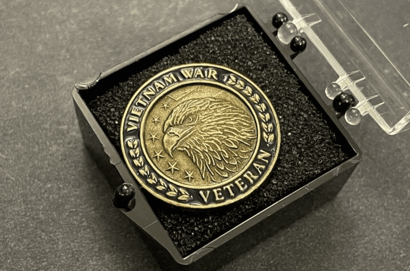 As part of the program, any U.S. veteran who served in active duty in the U.S. Armed Forces at any time during the period of Nov. 1, 1955 to May 15, 1975 were eligible to receive a Vietnam veterans pin. The pin features an eagle to represent courage, honor and dedication to service. The pin has a laurel wreath that represents integrity and strength, and has six stars representing Australia, New Zealand, Philippines, South Korea, Thailand and the United States which served alongside each other during the Vietnam War. The back of the veteran’s pin has the words, “A Grateful Nation Thanks and Honors You.”