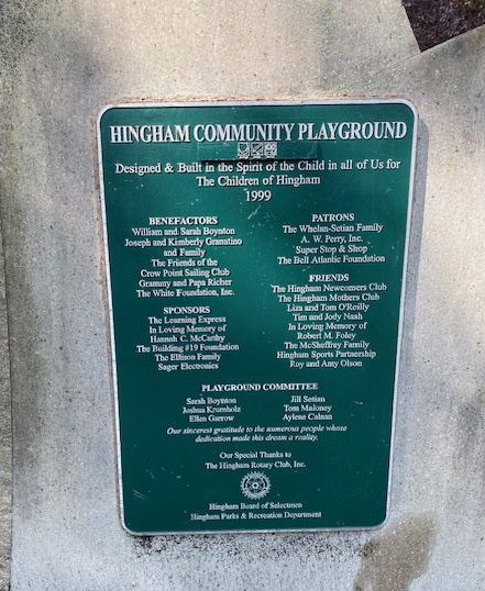 The plaque acknowledges benefactors, patrons, sponsors, and friends who contributed to making the playground happen “in the spirit of the child in all of us for the children of Hingham.”