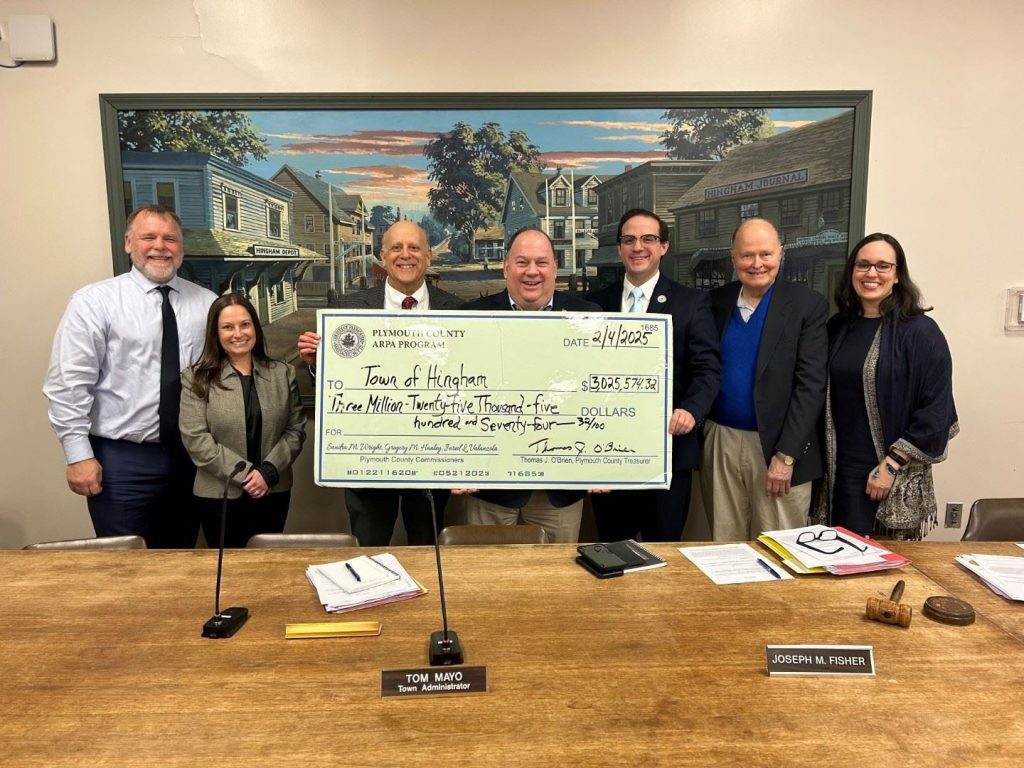 Plymouth County Commissioner Jared Valanzola and Treasurer Tom O’Brien presented the Hingham Select Board with a check for $3,025,574.32 in federal American Rescue Plan Act (ARPA) funds. These funds mark the final portion of the total $4.4 million allocation to the Town.