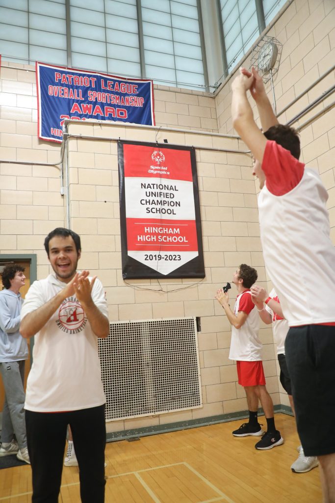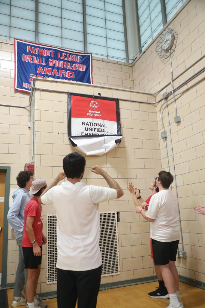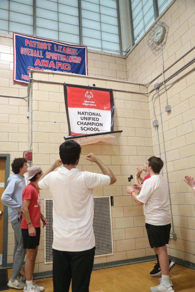 This past Friday, in front of a packed gym and before the halftime dance party, Hingham's Unified basketball team unveiled the newest banner in hanging from the walls of HHS - Special Olympic's National Certified Champion School banner.