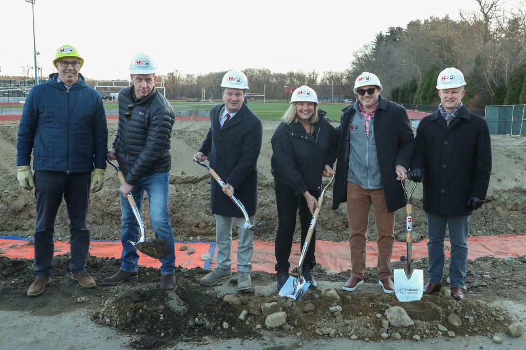 Hingham Sports Partnership (HSP) Board members, town and school officials, corporate supporters, students, and members of the community gathered to ceremoniously break ground to mark the beginning of construction on The DOCK, a wellness and fitness center at Hingham High School.