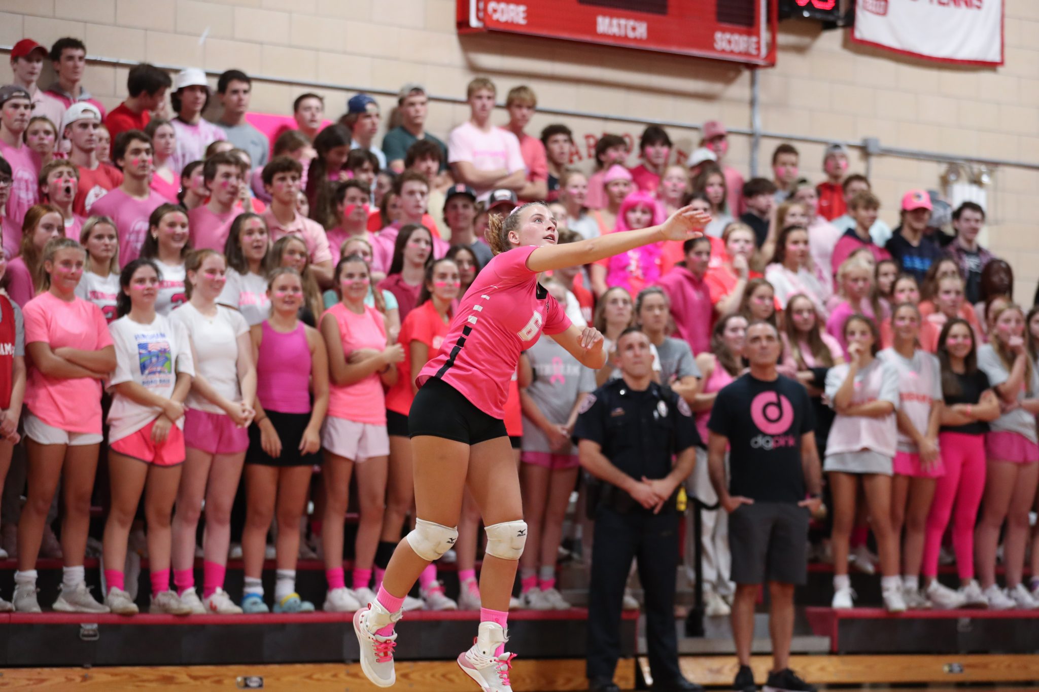 Senior Alex Kennedy serves in front of a sea of pink to start the match for Hingham's Annual Dig Pink Fundraiser.
