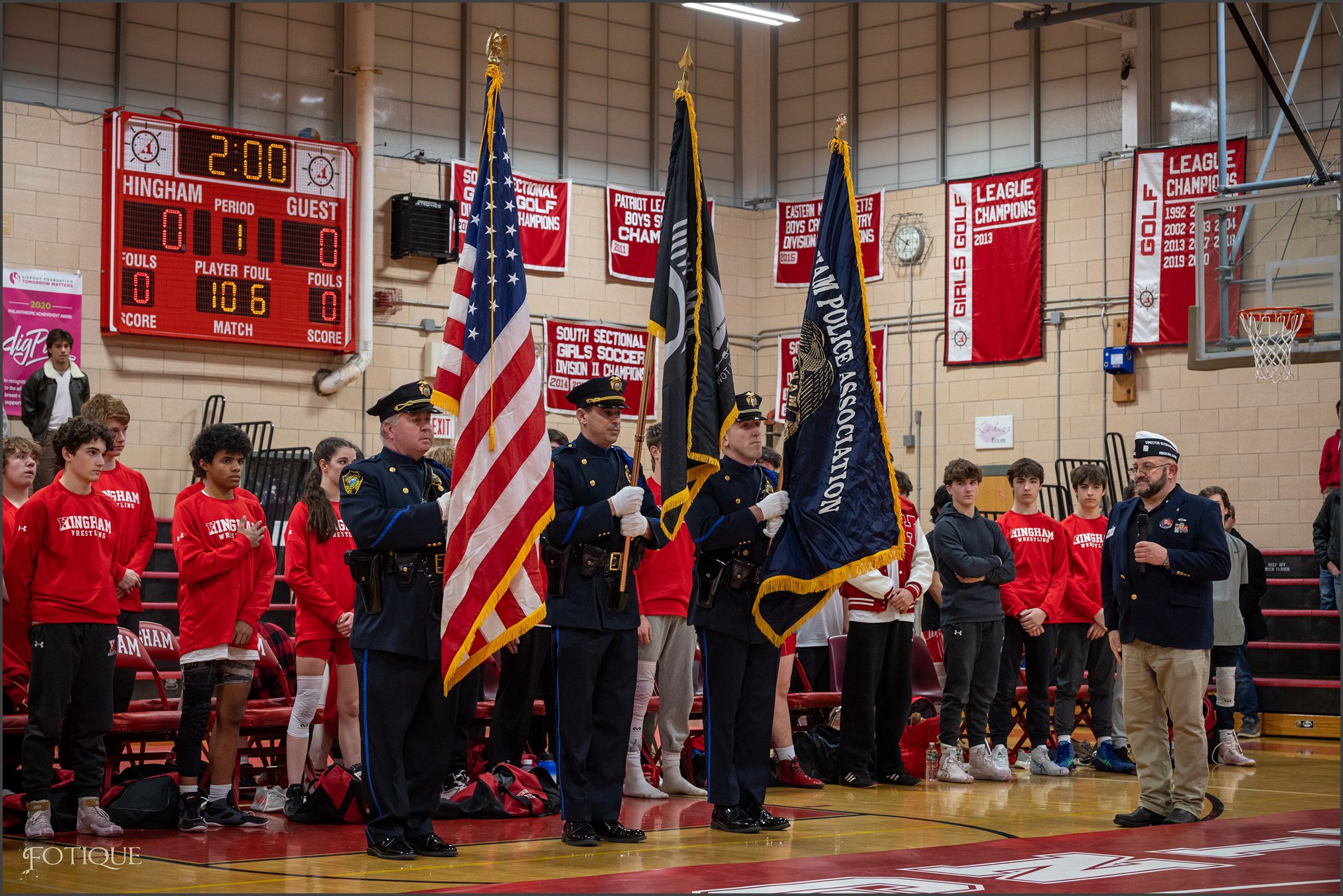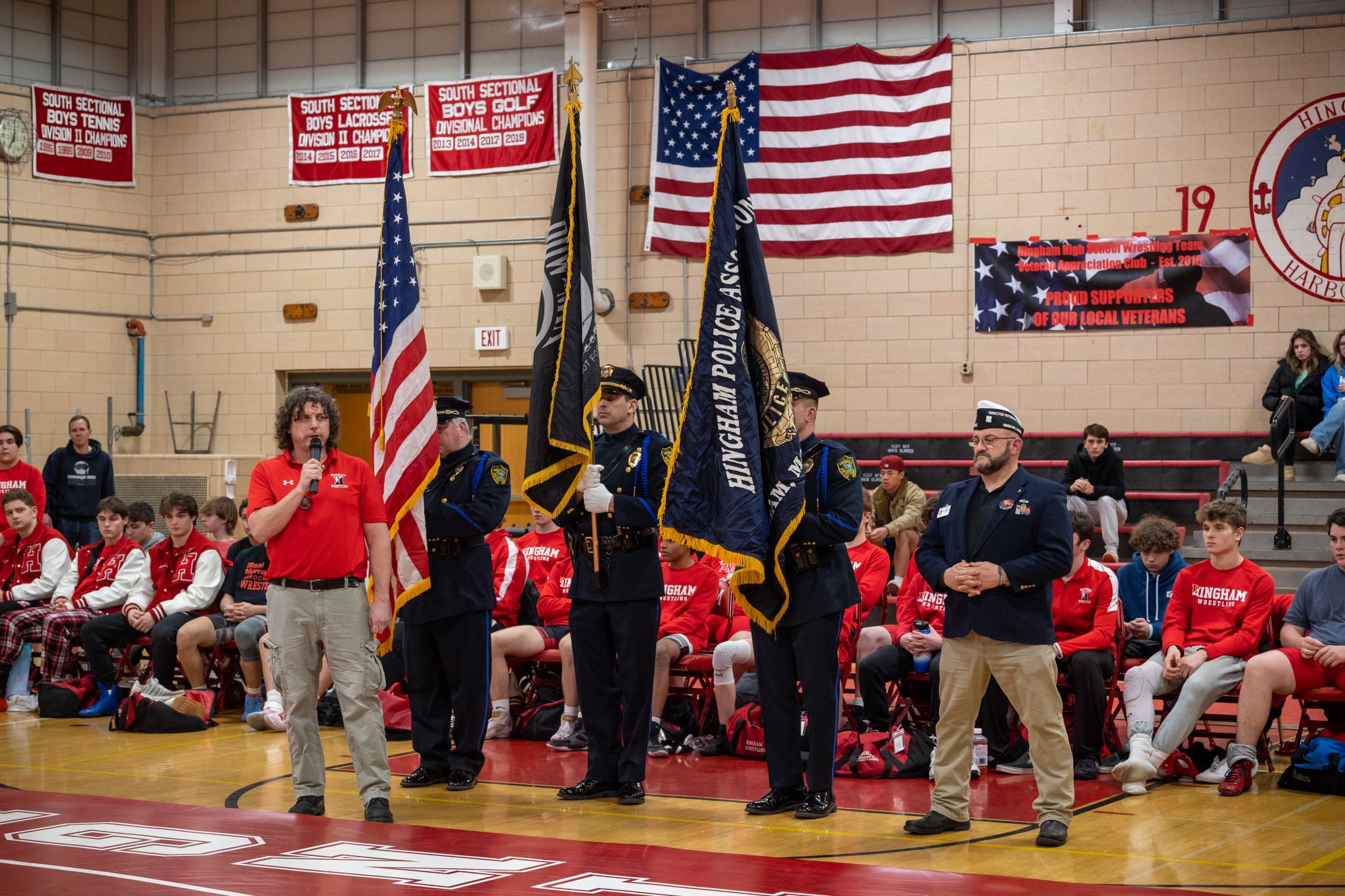 Hingham High School’s wrestling team honored local veterans before last night’s match against Plymouth North. The special ceremony included remarks by State Representative Joan Meschino, Select Board members Liz Klein and Joe Fisher, and head wrestling coach Paul Canniff. Those in attendance also remembered those service members who are no longer with us, including former Hingham wrestler Sgt. Matthew Partyka, who’s varsity jacket displayed on a chair by the mat.