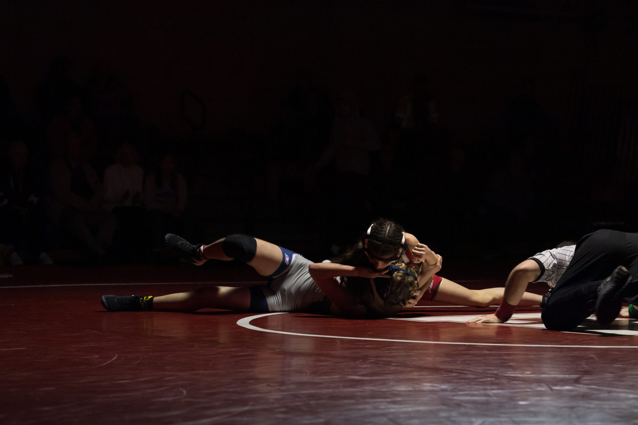 Sophomore Mia Dineen pins her opponent for the win.