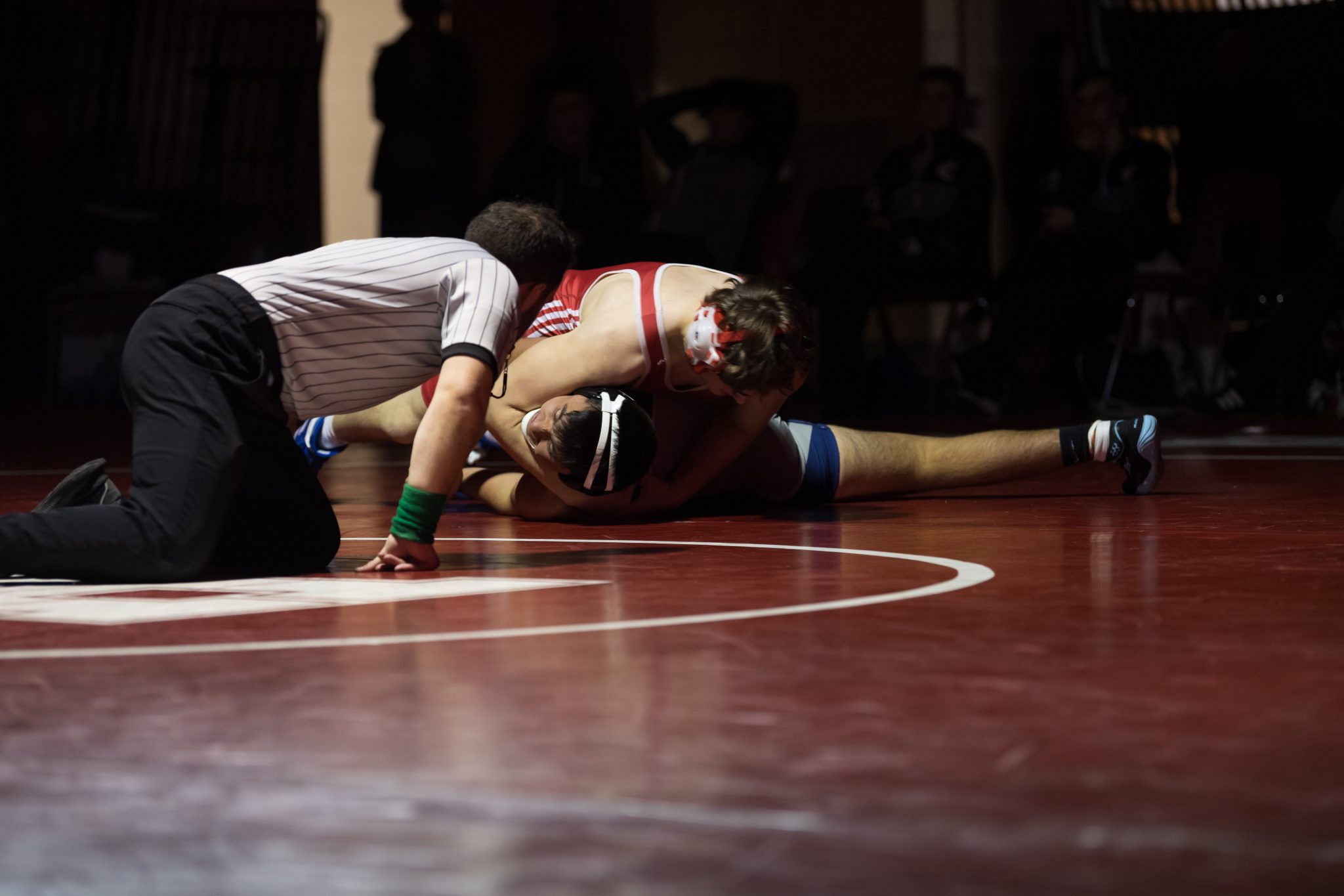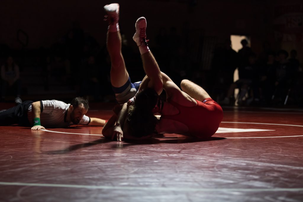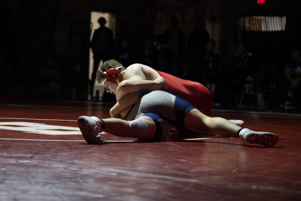 Senior Mike Schwartz puts his opponent in a headlock attempting to get his shoulders to the mat.