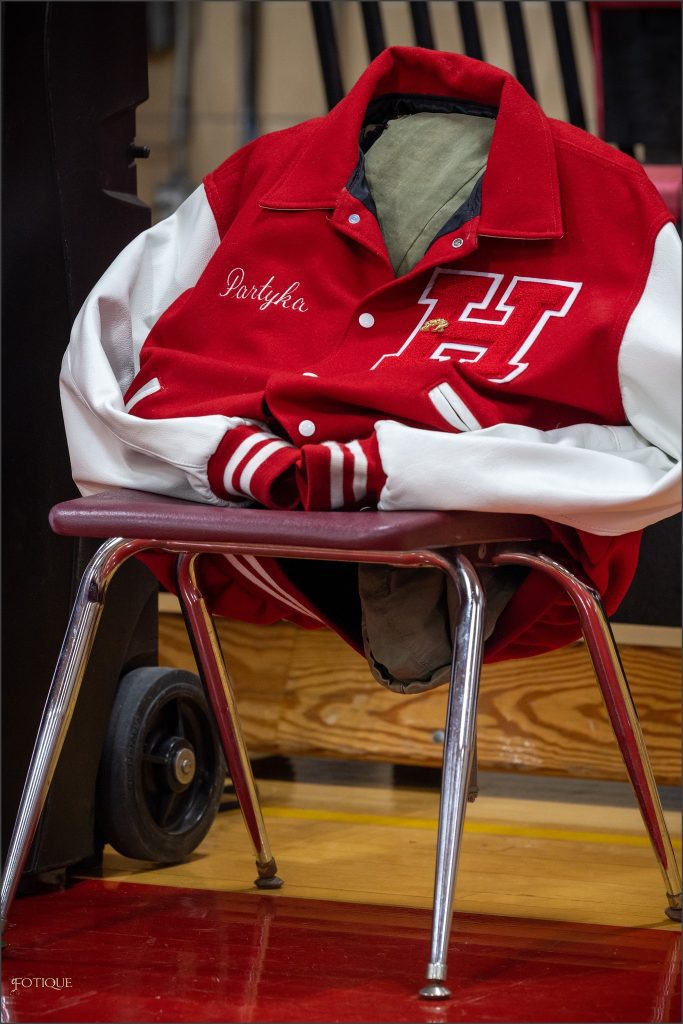 The varsity jacket of former Hingham High School student Sgt. Matthew Partyka was displayed during the meet.