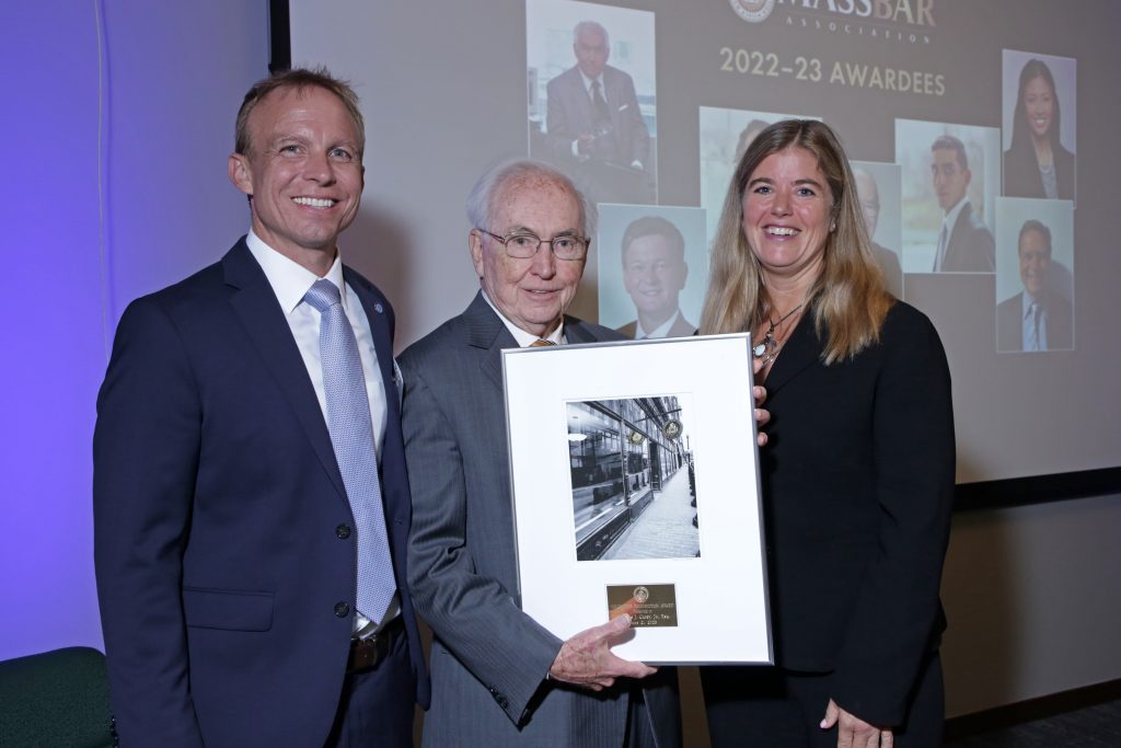 Hingham resident Thomas J. Carey Jr. (center) receives the Massachusetts Bar Association’s Volunteer Recognition Award from MBA President-elect Damian J. Turco (left) and MBA President Grace V.B. Garcia (right).