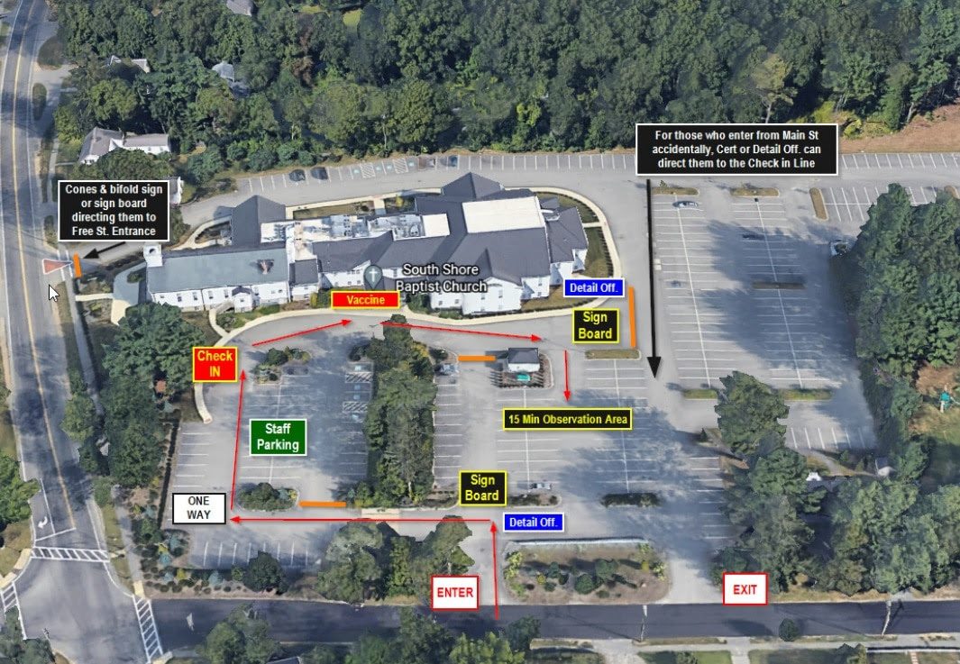 Upon arrival to the site, vehicles should enter the parking lot through the Free Street entrance (not the Main Street entrance) where they will be directed to the check-in area before proceeding to the vaccination point. Once the shot has been given, vehicles will be directed to a designated area of the parking lot for medical observation of residents post-vaccination.