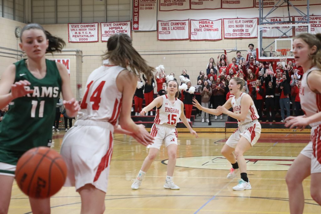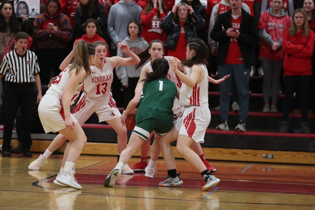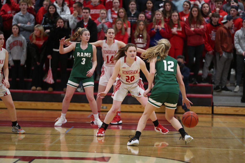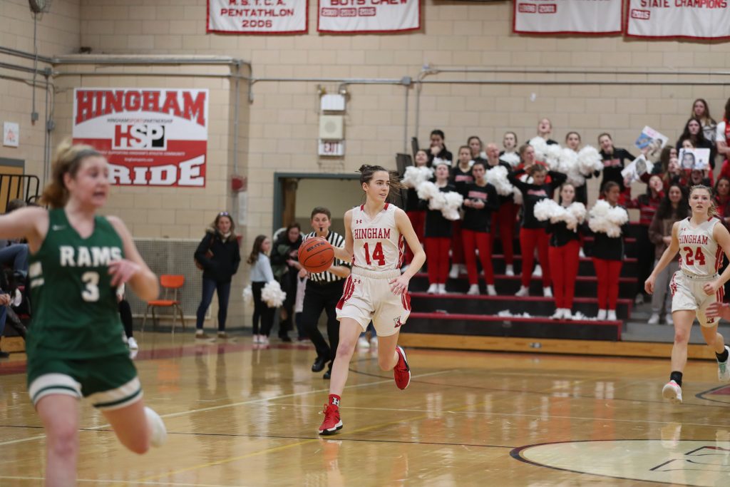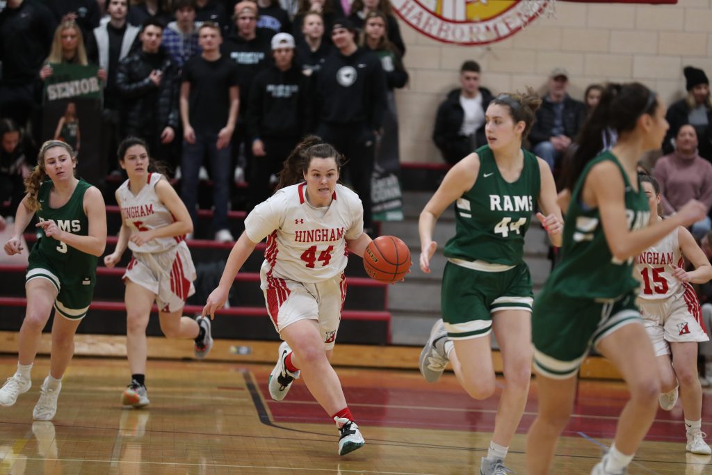 The moment seemed to jump start her teammates as the game got off to a slow start. In their third meeting in two weeks, both teams seemed to have some playoff nerves in the first quarter. Junior Sarah Holler single-handedly kept her team in it the first quarter with her hustle and the fact she grabbed every available rebound. Once Blasetti scored the three to give her team the lead, the nerves settled and they began to play their game. They aggressively drove to the basket and dove for every loose ball causing Marshfield’s top players to get in early foul trouble. It was close throughout the game until junior captain Colette Hanney drained a three pointer as time expired in the third quarter extending the Harborwomen’s lead to 40-35, topping off a 7-0 run to end the quarter. Hingham locked it down in the fourth quarter only giving up four points to the Rams. The Harborwomen outscored Marshfield 25-5 to close out the game and secure them a spot in the round of 16 vs Springfield Central.