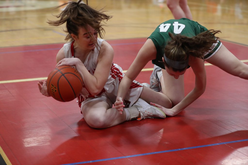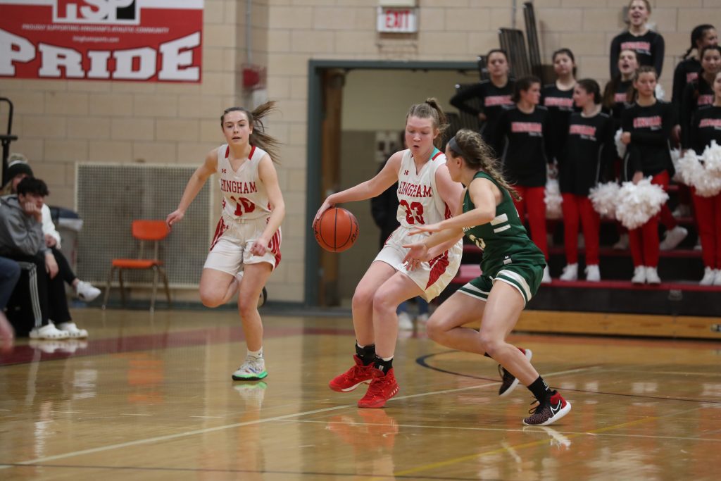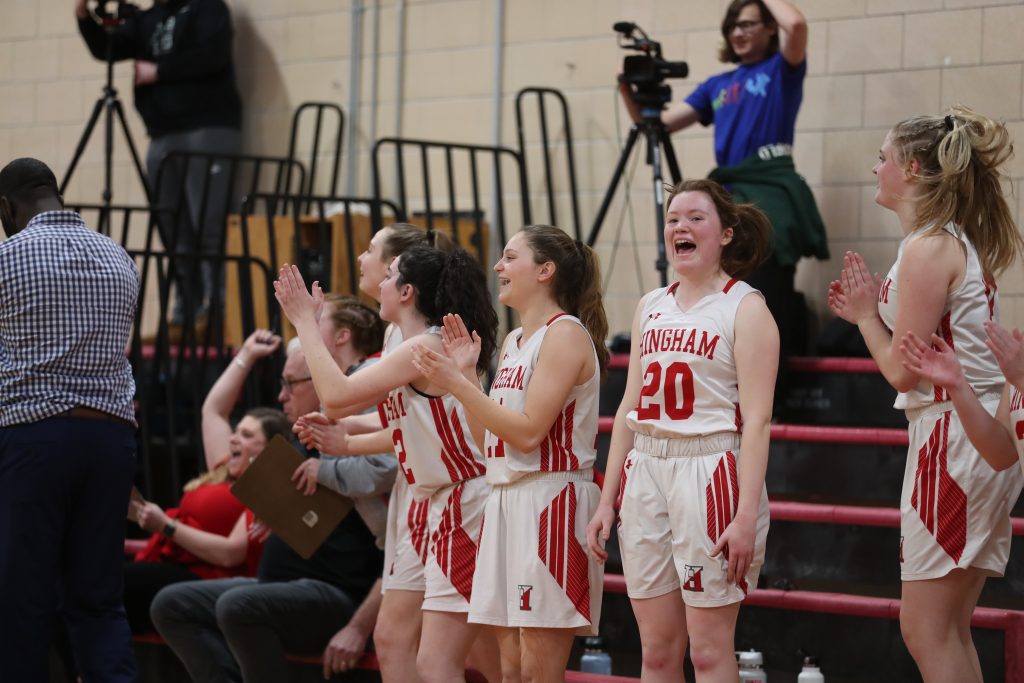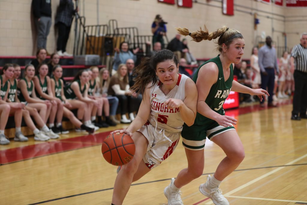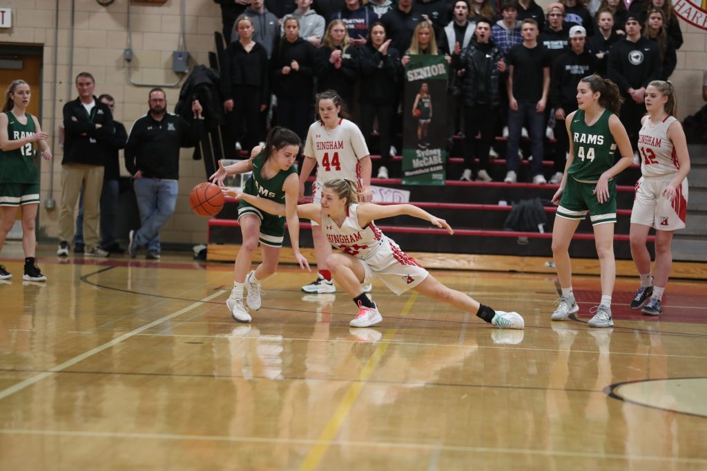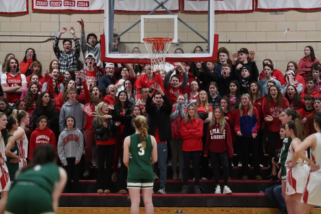 The moment seemed to jump start her teammates as the game got off to a slow start. In their third meeting in two weeks, both teams seemed to have some playoff nerves in the first quarter. Junior Sarah Holler single-handedly kept her team in it the first quarter with her hustle and the fact she grabbed every available rebound. Once Blasetti scored the three to give her team the lead, the nerves settled and they began to play their game. They aggressively drove to the basket and dove for every loose ball causing Marshfield’s top players to get in early foul trouble. It was close throughout the game until junior captain Colette Hanney drained a three pointer as time expired in the third quarter extending the Harborwomen’s lead to 40-35, topping off a 7-0 run to end the quarter. Hingham locked it down in the fourth quarter only giving up four points to the Rams. The Harborwomen outscored Marshfield 25-5 to close out the game and secure them a spot in the round of 16 vs Springfield Central.