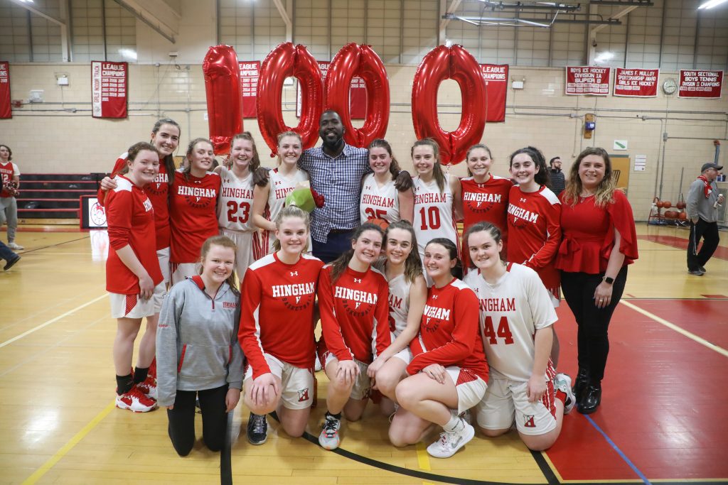 With just under seven minutes to go in the second quarter and her team down by two, the senior captain dribbled up the court, pulled up beyond the three point line and as the ball sailed through the netting, etched her name in the history books forever. At the next whistle, the game stopped and Hingham AD Jim Quatromoni announced to the crowd and to Blasetti herself, that she just became the only the second player in Hingham High School to score 1,000 career points. She had no idea she needed only 9 points to reach the milestone. Only a handful of people knew. Even her sister Ryley, who was in attendance, had no idea.