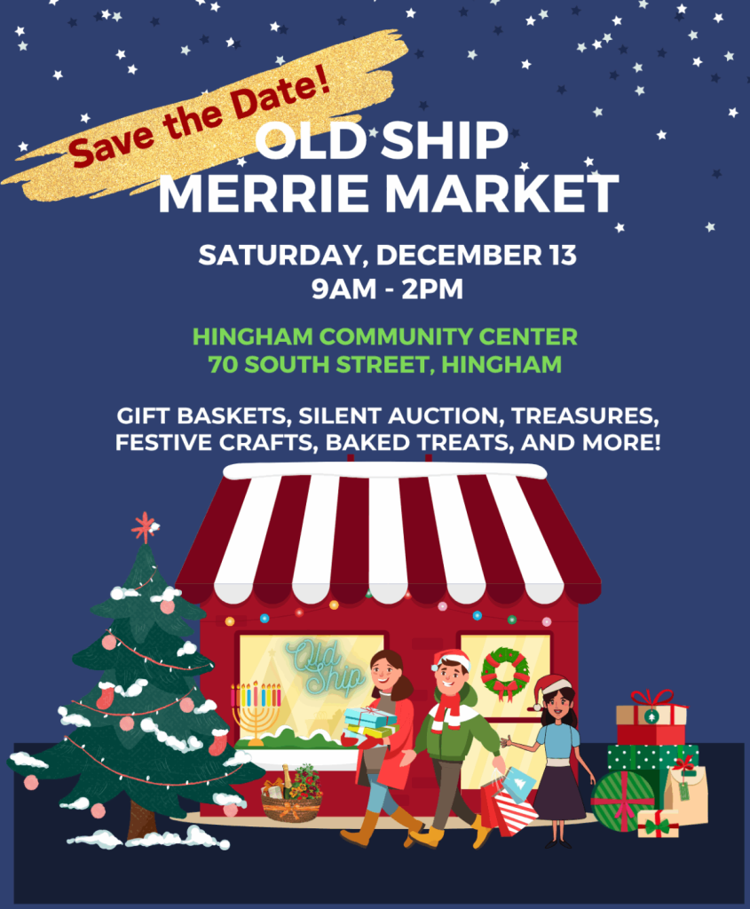 This year’s Old Ship Merrie Market at Hingham Community Center from 9 a.m. to 2 p.m. will feature gift baskets, jewelry, holiday decorations, a treasures table – featuring vintage, antique, new land gently-used items, and framed art – handcrafted gifts, stocking stuffers, a caricature artist, potted bulbs, a silent auction, baked treats, and more. Mark your calendar for Saturday, Dec. 13.