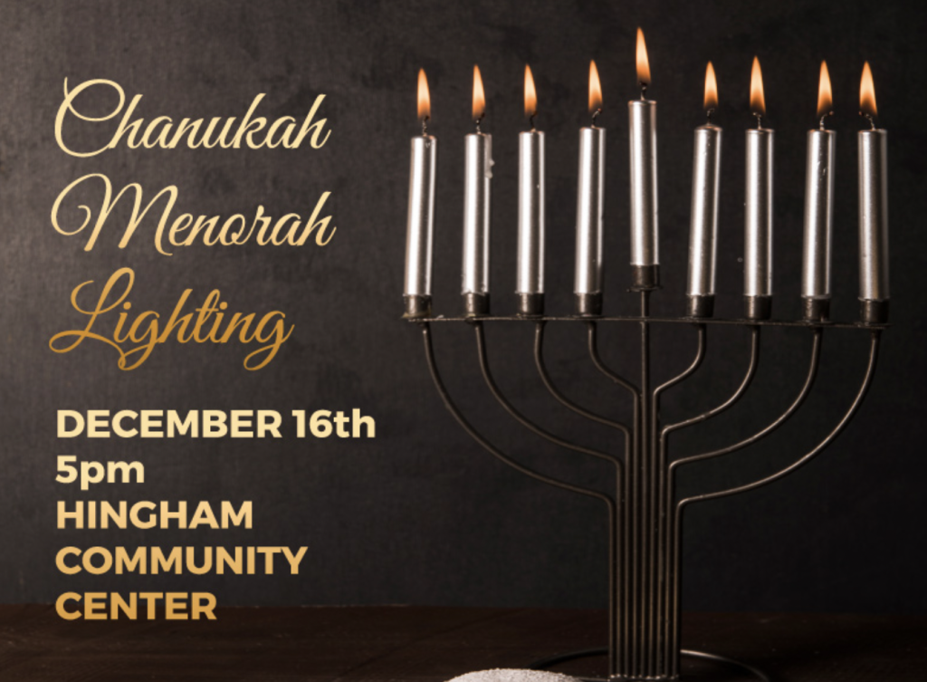 The community is invited to the annual Chanukah Menorah Lighting Tuesday, Dec. 16, at 5 p.m. at Hingham Community Center. All are welcome. There will be complimentary hot cocoa, donuts, Chanukah dreidels, and gelt.