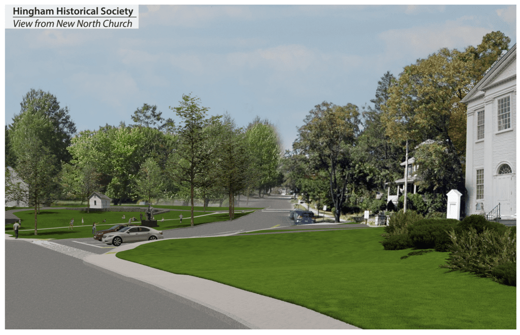 Another benefit of this new design is to provide a safer crossing for pedestrians traveling between the Benjamin Lincoln House and Old Ordinary. A bump-out in front of New North Church will provide more green space.