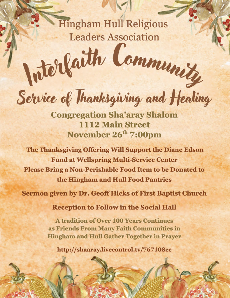 Next Wednesday evening, November 26 at 7:00 pm, the Hingham and Hull Religious Leaders Association will gather the community for its annual Interfaith Service of Thanksgiving and Healing. The tradition, now approaching its centennial, has long served as a moment for residents to come together, reflect, and share in a spirit of gratitude.