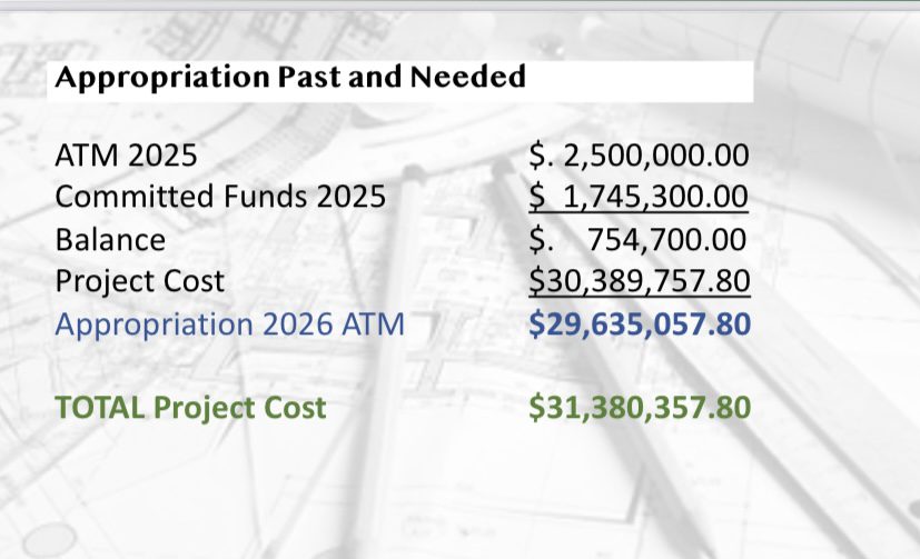 The estimated project cost presented to Town Meeting 2025 was $34.1 million. If the project passes muster at next Spring’s annual Town Meeting, the targeted opening timeframe is 2028.