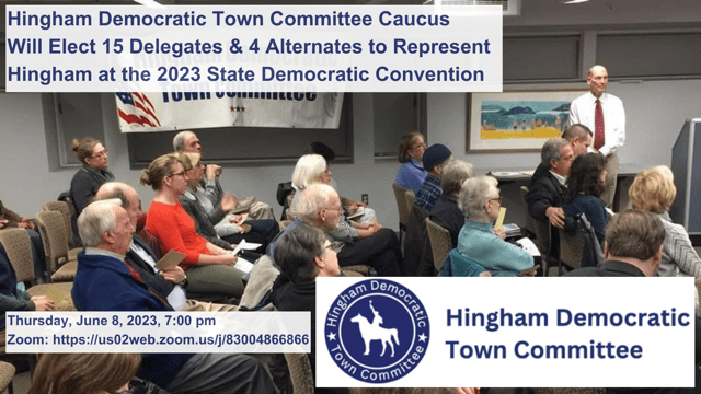 The Hingham Democratic Town Committee is excited to announce a virtual caucus on Thursday, June 8, 2023, 7:00 pm. Registered Democrats in Hingham will come together via Zoom at to elect 15 delegates and 4 alternates to represent our community at the highly anticipated 2023 State Democratic Convention. All registered and pre-registered Democrats in Hingham, who are at least 16 years old by May 23, 2023, are invited to participate in the caucus as both voters and potential candidates for the delegate and alternate positions.