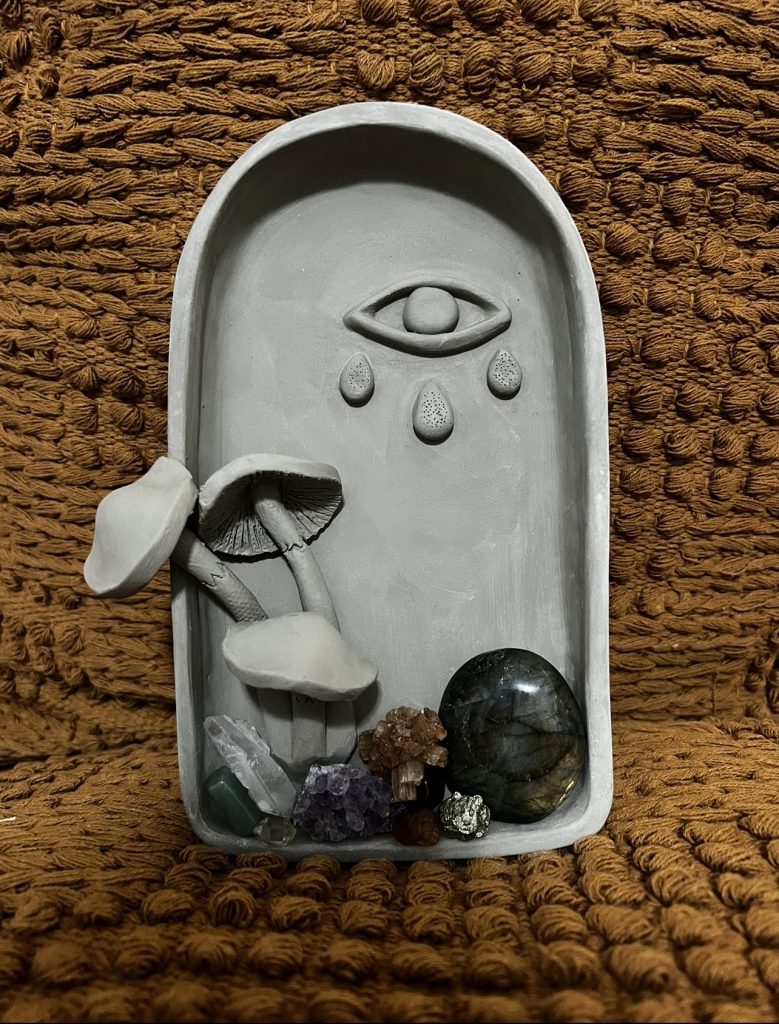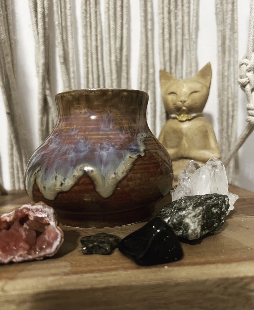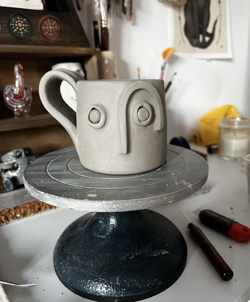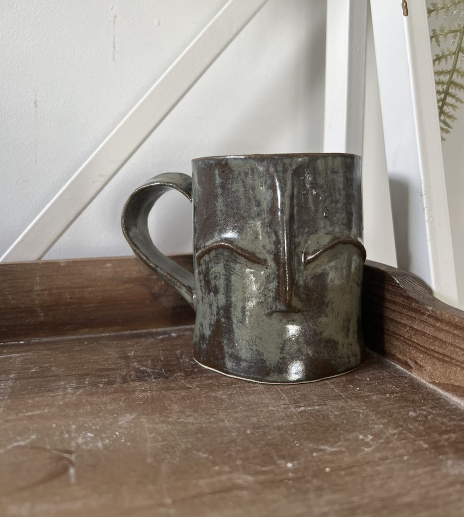 Many of my pieces feature mushrooms or other nature elements in natural-inspired hues and tones. I pull inspiration from the woods around me. I also have a passion for crystals and that theme always seems to come out in my work. I love learning about the history of crystals; each crystal has a unique story to tell. One of my signature and most beloved pieces is called the bee mug. It was inspired by a teacher and beekeeper, and I wanted to make him a special piece of art in honor of his bee passion. I ended up loving the outcome and kept making more bee mugs. I am always inspired by all the little joys in people’s lives.
