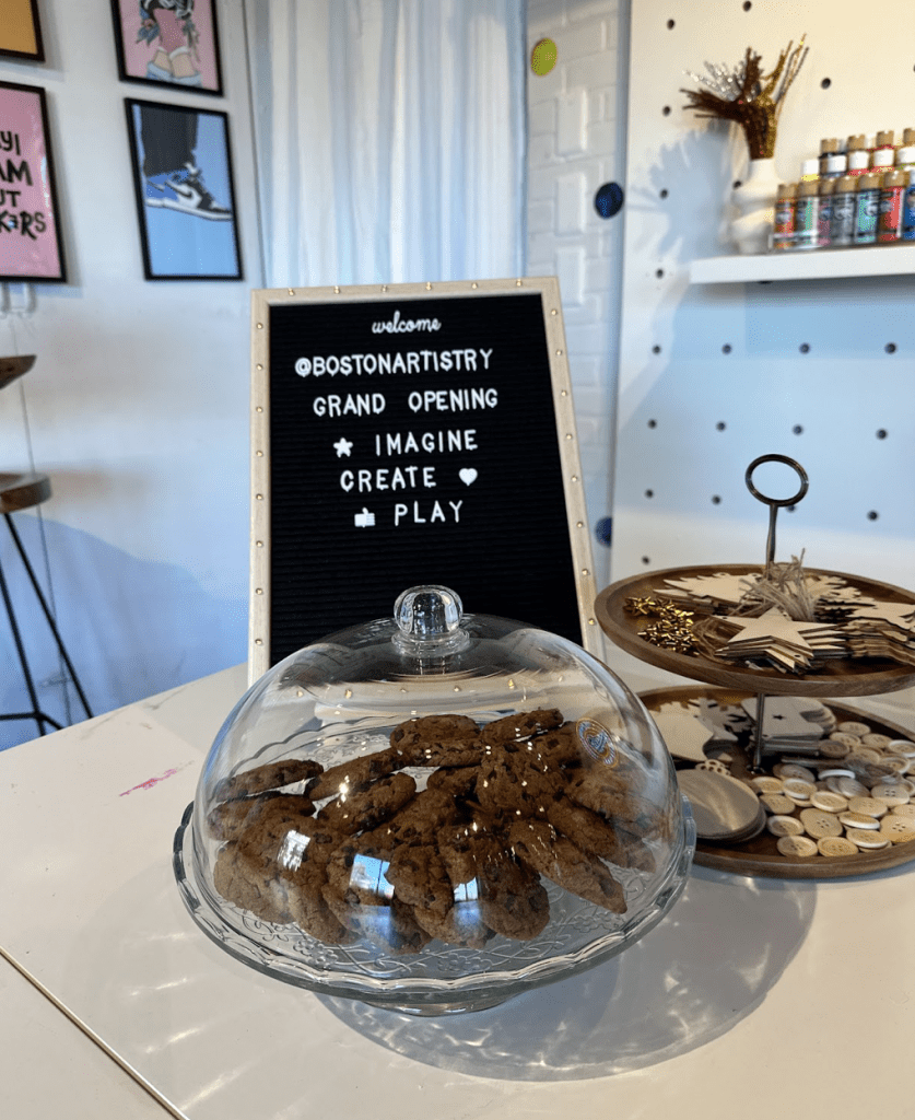 The brand new Boston Artistry Sneaker Bar at 69 Water Street in downtown Hingham is an arts space for the entire family. Designer Nandita S. Maan has turned her vision for art, design, and creativity into a hub for artists, creators, and family fun. The Boston Artistry Sneaker Bar is a space for creating art in a supportive and encouraging environment. From creative workshops to birthday parties to special events, the space welcomes all–babies to adults–to explore various modes and mediums of art. Think: sneaker design; tote bag decoration; coloring; painting stenciling, t-shirt, vinyl, and textile printing; printmaking; poster making; and more.