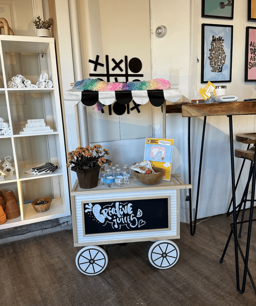 Walking into the space is a real treat; the walls are painted white with a contrasting black ceiling, and catenary lighting. Maan likes to think of the space as a blank canvas that adapts to the personality of participants. Each wall and area thoughtfully displays various artistic mediums in an approachable way, and that’s what Maan wants: for people to explore, try something new, and have fun. She’s decorated the space with retro lighting design installations with nods to Keith Haring, pop-flowers, and colorful posters.