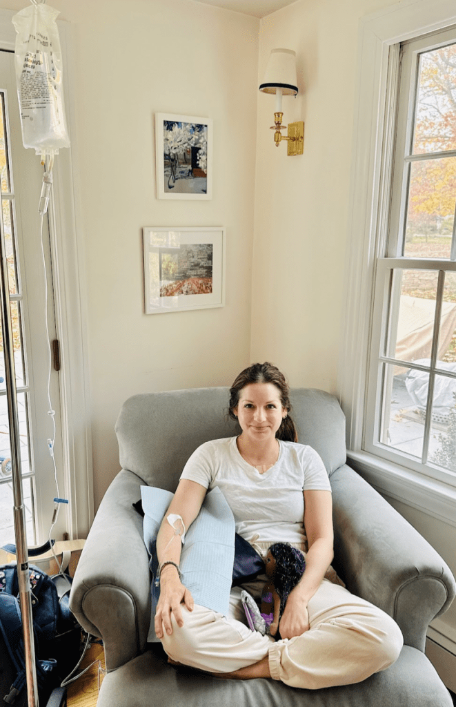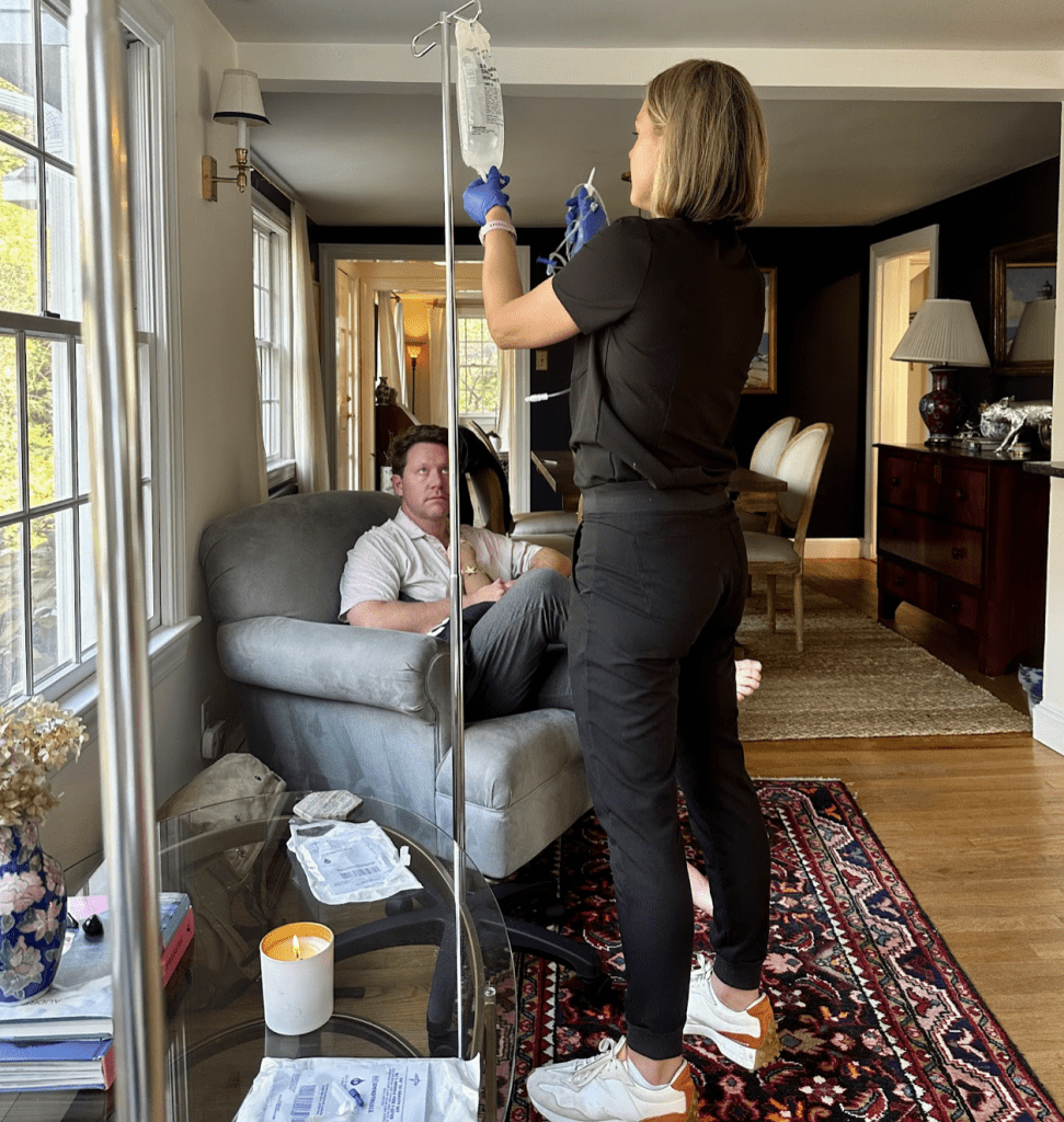 On the day of our appointment, Denise arrived with Zero Gravity chairs (although we opted for our own chairs), pillows, and blankets to provide us with the utmost comfort. She also came with IV medical poles, a rolling tray, medical bag, and extra gloves.