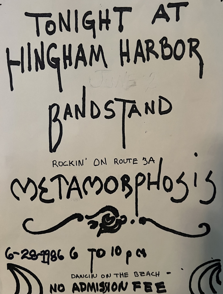 Flashback to June 28th, 1986 for the first of a series of rock concerts at the Hingham Harbor Bandstand featuring Hingham’s own Metamorphosis. The 1986 concerts were organized by Peggy (Warner) Magner, a lifelong friend of the band’s founding members and fellow Hingham High School (HHS) classmates. Organizing the concert was a labor of love for Magner who was required to obtain permission for the concert series from the Hingham Selectboard in the spring of 1986. Selectman Edward Lewieki stated he would allow the event if, “concert goers behave themselves.” (Hingham Journal, May 22, 1986).