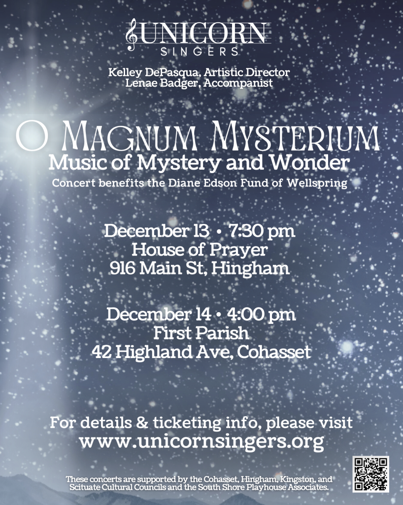 The Unicorn Singers, Hingham’s own renowned choral ensemble, will present Mystery and Wonder: Music for the Holiday Season on Sunday, December 14 at 4:00 p.m. at First Parish Church, 23 N. Main St. in Cohasset. Tickets are available now at https://unicornsingers.ludus.com/index.php. This concert is for all ages and typically sells out in advance.