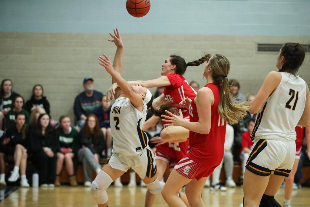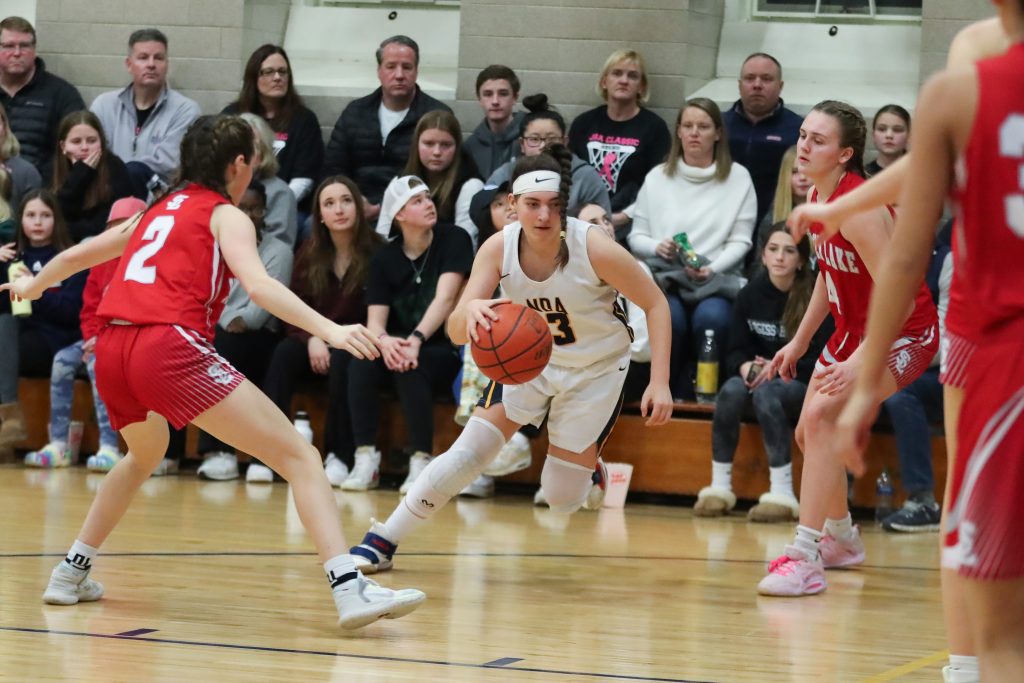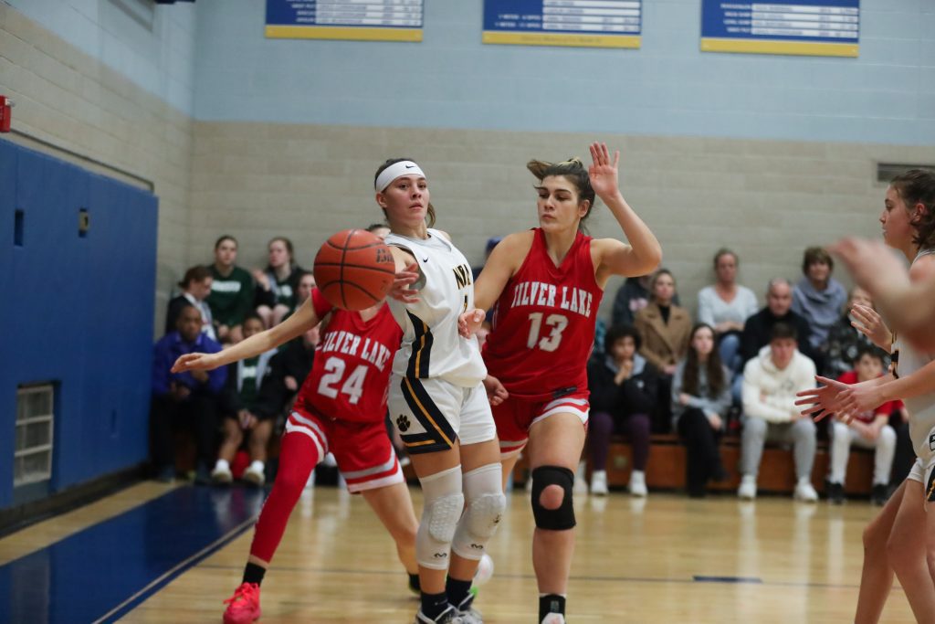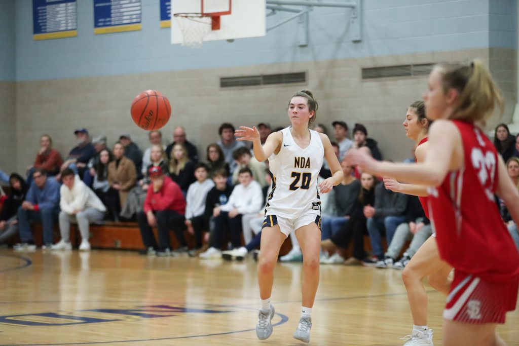 Junior captain Lola Paradis drives to the basket in NDA’s win over Silver Lake in the JBA Classic.