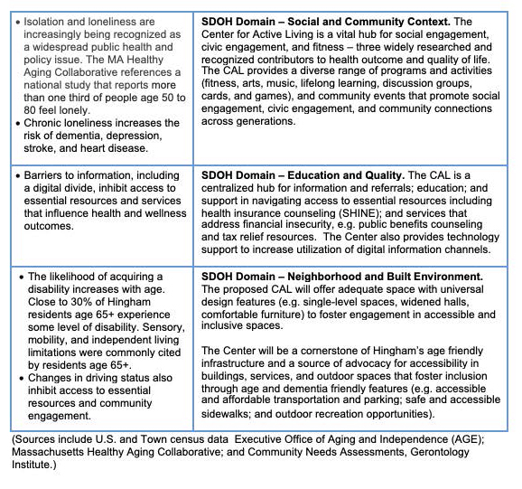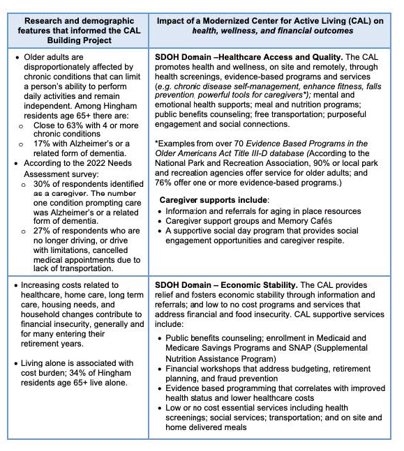 The benefits of an adequate and accessible Center for Active Living (CAL) at Bare Cove Park Drive are profound and far reaching— improved health outcomes and economic stability for residents, the community, and healthcare systems. There are costs and risks associated with not building the proposed CAL.
