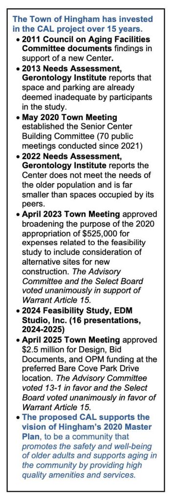 For close to 15 years, I have volunteered in support of initiatives that relate to Hingham’s substantial and growing population of older adults, alongside countless dedicated and talented advocates. In 2012, as a new member of the Council on Aging, I was informed of limitations and evolving plans to expand or build a new Center. A Facilities Committee had been established in 2011, and members were conducting visits to learn best practices from peer communities. A 2012 report from the committee stated, “looking at the future senior population based on projections provided by the MAPC, the town of Hingham will have an age 60+ population of 8,500 in 2030”. (Today, there are close to 8,000 residents over age 60.) Based on projections, the 2012 report proposed a range of 32,000 SF– 39,000 SF Center for the goal of initiating construction by 2020. (39,000 SF was calculated to reflect growth through 2030.) Today, the community is nearing Town Meeting 2026, a pivotal crossroads, with a significant opportunity to build an adequate (and smaller than proposed in 2012) Center for Active Living. In light of questions and varying levels of awareness, I am sharing key facts and findings to provide context and clarity for continuing conversations; and to deepen understanding and support for the proposed Center for Active Living.