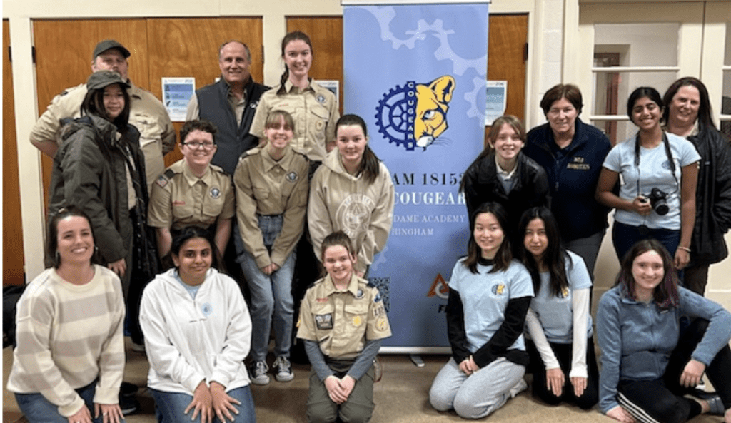 The evening kicked off with team members sharing lots of insights on coding, competitions, safety, robot design, and being involved in the community. Each member who spoke shared their own experience depending on their role on the team. Topics included building the robot, writing the program that runs the robot either autonomously or driver-driven, safety issues that they have to keep always on their mind, and ways that robotics and technology can affect our world. Coaches Anne Marie Clogston spoke on her background in technology and what she enjoys about being a coach. Additionally, the scouts and their leaders heard from Coach Lucy Driscoll, a graduate of NDA, who began her career in technology at iRobot and is now working with another new startup using robots to impact a common practice in commercial settings that might become more common in your home!