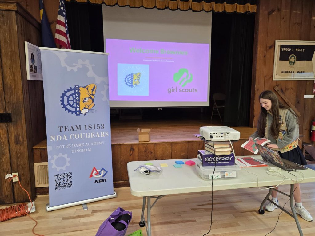 Sure! My idea was to develop an age-appropriate introduction to robotics that would help young members of scout troop and school communities understand technology, coding, and building robots. My NDA robotics teammates were excited to share what we have been doing in our meetings and at competitions, so we worked together to make implementing the project informative and fun! We planned a script, so the content is very clear. I worked with Troop 77445 in Hingham at the Hingham Scout House. Everyone was super engaged. The girls completed their Design and Build Badges. My hope is that they will continue on to receive their more advanced technology badges. The troop leaders asked if we could come again and that’s a sign that everything went