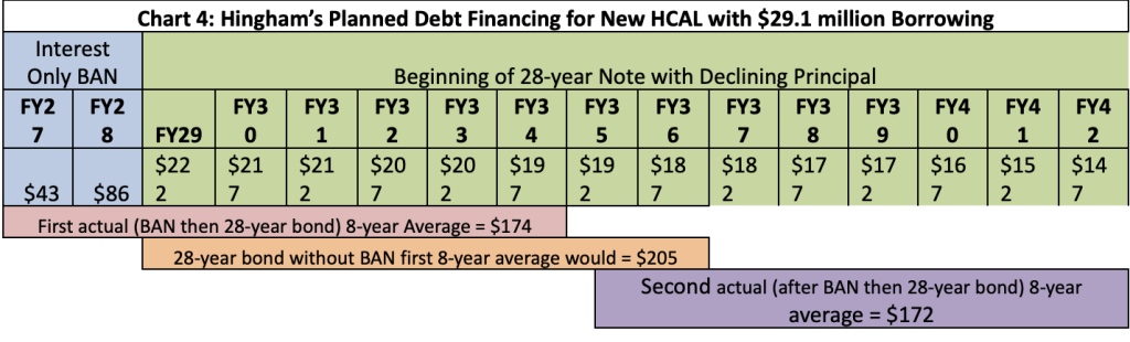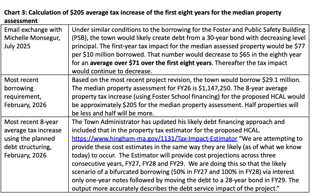 The Town Administrator has updated his likely debt financing approach and included that in the property tax estimator for the proposed HCAL. https://www.hingham-ma.gov/1131/Tax-Impact-Estimator “We are attempting to provide these cost estimates in the same way they are likely (as of what we know today) to occur. The Estimator will provide cost projections across four consecutive years, FY27, FY28, FY29 and FY30. We are doing this so that the likely scenario of a bifurcated borrowing (50% in FY27 and 100% in FY28) via interest only one-year notes followed by moving the debt to a 28- year bond in FY29. The output more accurately describes the debt service impact of the project.” - The revised financing structure would yield a lower average 8-year tax increase of $174.