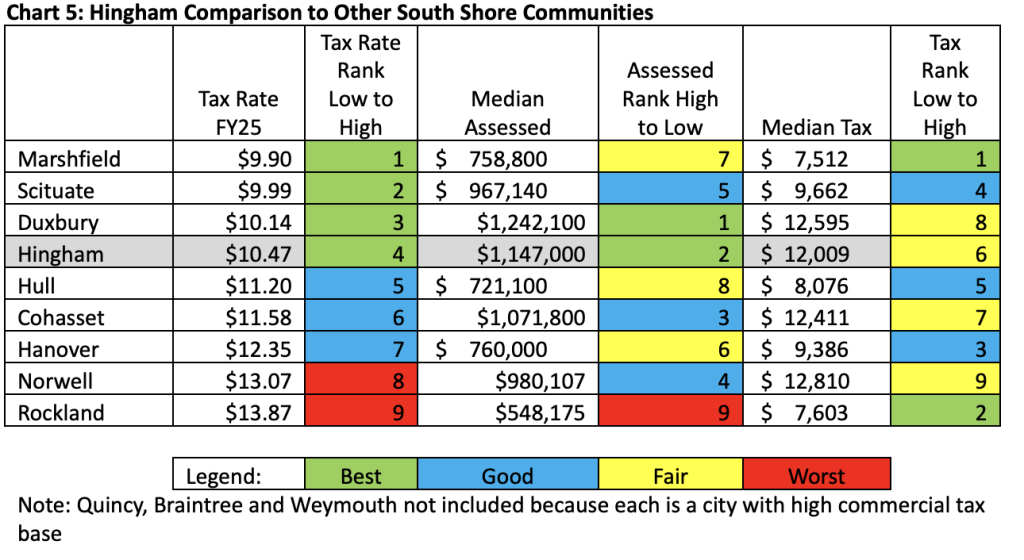 Hingham has one of the highest property values and lowest tax rates on the South Shore. Its median property tax is in the middle of South Shore communities. Norwell has one of the highest tax rates and highest median taxes but its median property value is lower than Hingham. (See chart 5 below)