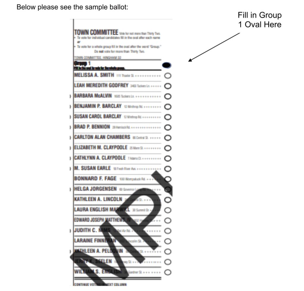 You will have the option to vote for all names in Group 1 by filling in the Group 1 oval, or you can select names individually. You only can vote to elect a total of 32 names between the two groups. If a voter chooses too many names or fills in both group ovals, the Hingham Republican Town Committee section will be disqualified (please note this will not impact the rest of your ballot).