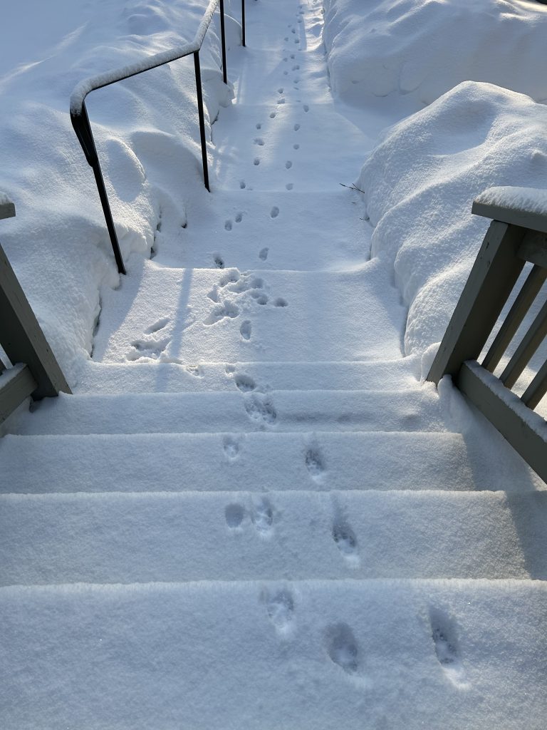 The snow is melting down, the evidence disappearing as the day goes on. When night approaches I turn on the deck light, having been informed that light and noise discourage coyotes from approaching. There’s another way, though, to think about the coyote’s visit. I turn again to Mr. Google for some perspective. Native Americans have a variety of beliefs, from the coyote being a trickster to a teacher to a master survivor. Some cultures see the coyote as a lucky symbol while others see a warning to be cautious. The best information I take from my research is “If a coyote has entered your life, it is often a reminder to stop taking things too seriously, to trust your instincts, and to be adaptable in the face of uncertainly.,” and I’m left now finding a positive meaning from my unexpected visitor.