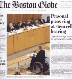 I also remember being invited to testify to the Mass Legislature in favor of stem cell research and then becoming the lead story on the evening news and front page of the Boston Globe.
