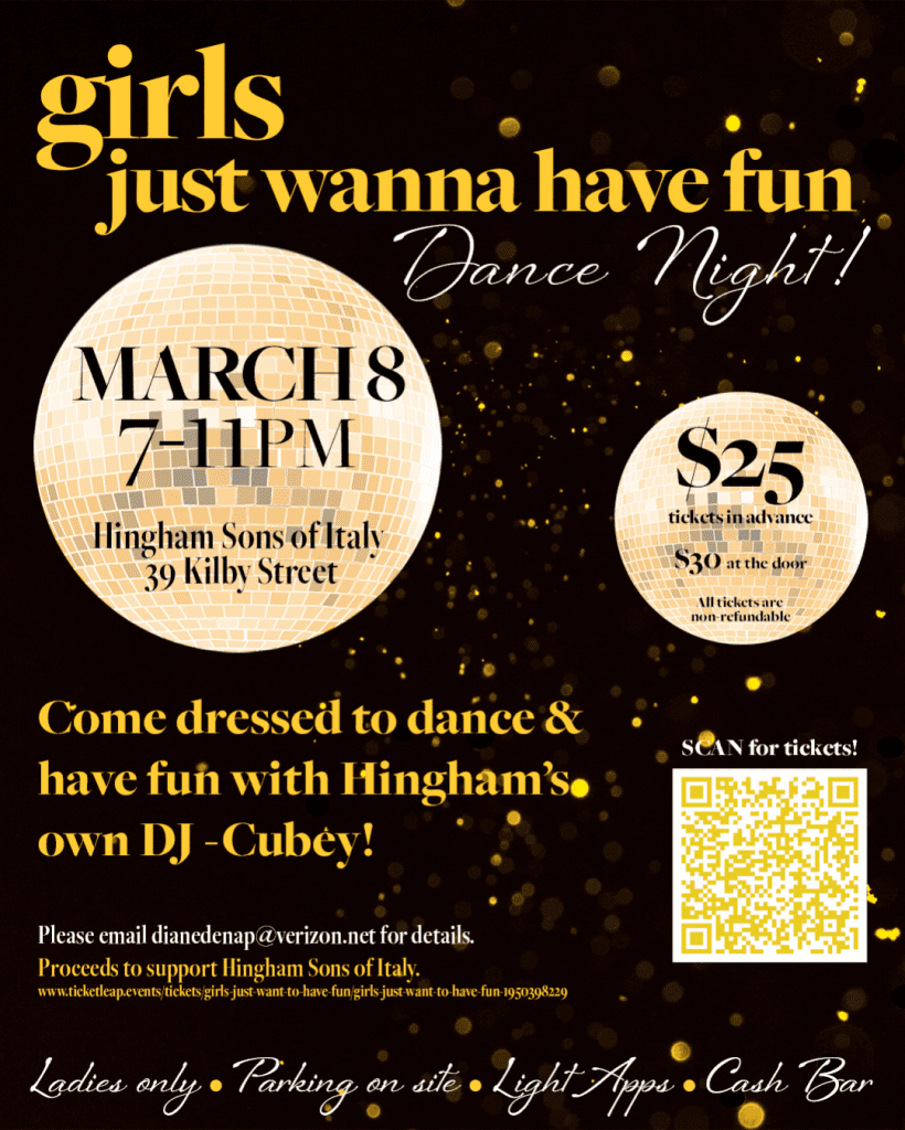On March 8th, International Women’s Day, the Sons and Daughters of Italy will be transformed into a pop- up club hosting a dance called Girls Just Want to Have Fun. This will be a ladies only event that is open to all ages who like to dance and celebrate our bonds of sisterhood. Tickets can be purchased in advance for $25.00, or at the door while supplies last for $30.00. Proceeds from the dance will go towards the Hingham Sons of Italy.