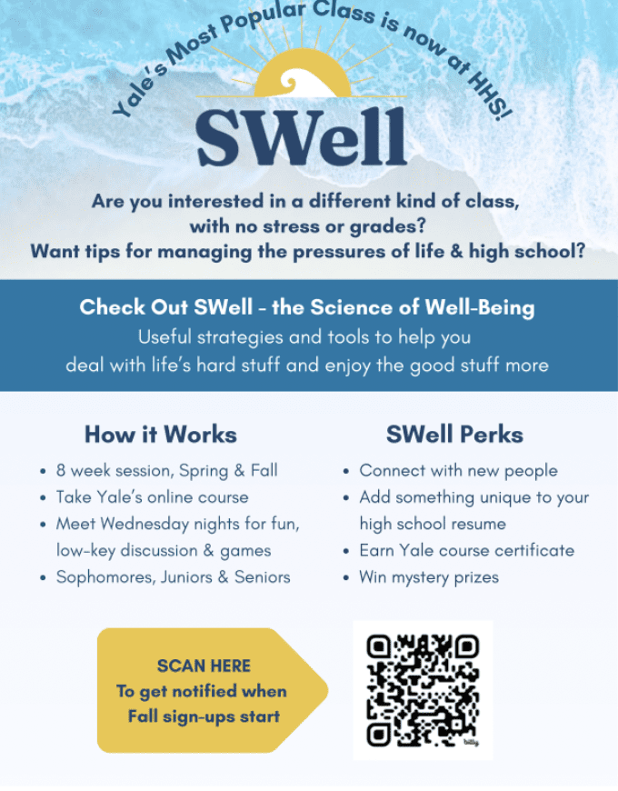 There are multiple, widespread initiatives meant to provide additional support for students. One initiative is Universal Screening. Every student is given a brief survey to find out their personal experience with stress and anxiety. Those with higher scores (indicating a higher anxiety level) are given a chance to talk to counselors and find the support they may need. There is also a newly introduced program outside of school called the Science of Well Being (SWell) which offers lessons on mental health coping strategies for students.