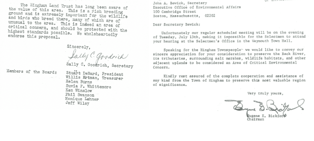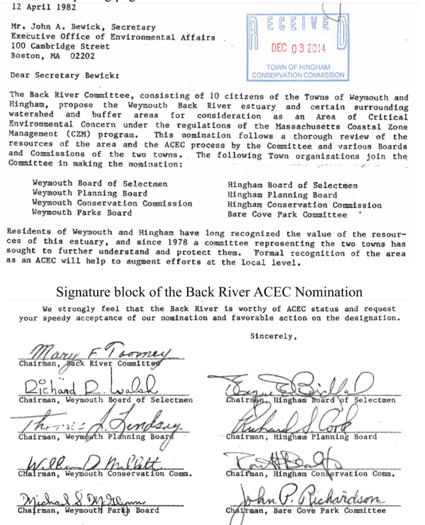 In doing its work over a 4-year period, the Back River Committee engaged in considerable study and discussion before selecting the area to nominate as an ACEC. The parcel selected was the “most critical or sensitive to development pressures.” The ACEC nomination was championed by the Town of Hingham’s Select Board (chair Eugene Bickford), Conservation Commission (chair Robert Beal Jr.), Planning Board (chair Richard S. Cook), and Bare Cove Committee (chair John P. Richardson). In the official designation of the Back River ACEC signed by the then Secretary of Environmental Affairs, John Bewick (husband of Martha Reardon Bewick), himself a Hingham resident, he pointed out that “the resources of the Back River, its surrounding lands and portions of its water shed have remained largely unaltered despite the generally urban setting” and that it “remains a natural area in the midst of expanding urban/suburban development.”