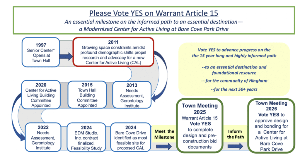 Please support Article 15 to meet a long awaited milestone and advance the next phase of design. Vote YES to ensure an onward and informed path to Town Meeting 2026, at which time there will be a subsequent vote to approve the design and bonding for a Center for Active Living (CAL) at Bare Cove Park Drive.