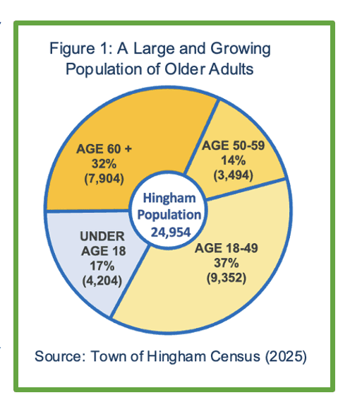 It’s an epic time of aging in Hingham, and across the country. In 2024 the youngest (of an estimated 75 million) baby boomers turned 60. By 2030, for the first time in the country’s history, the share of people over age 60 will outnumber the share under age 18. Many towns, including Hingham, have already reached this historic milestone. The share of residents age 60 and over nearly doubled from 17% in 1997 to 32% in 2025. Projections estimate that close to 40% of the community will be over age 60 by 2030.