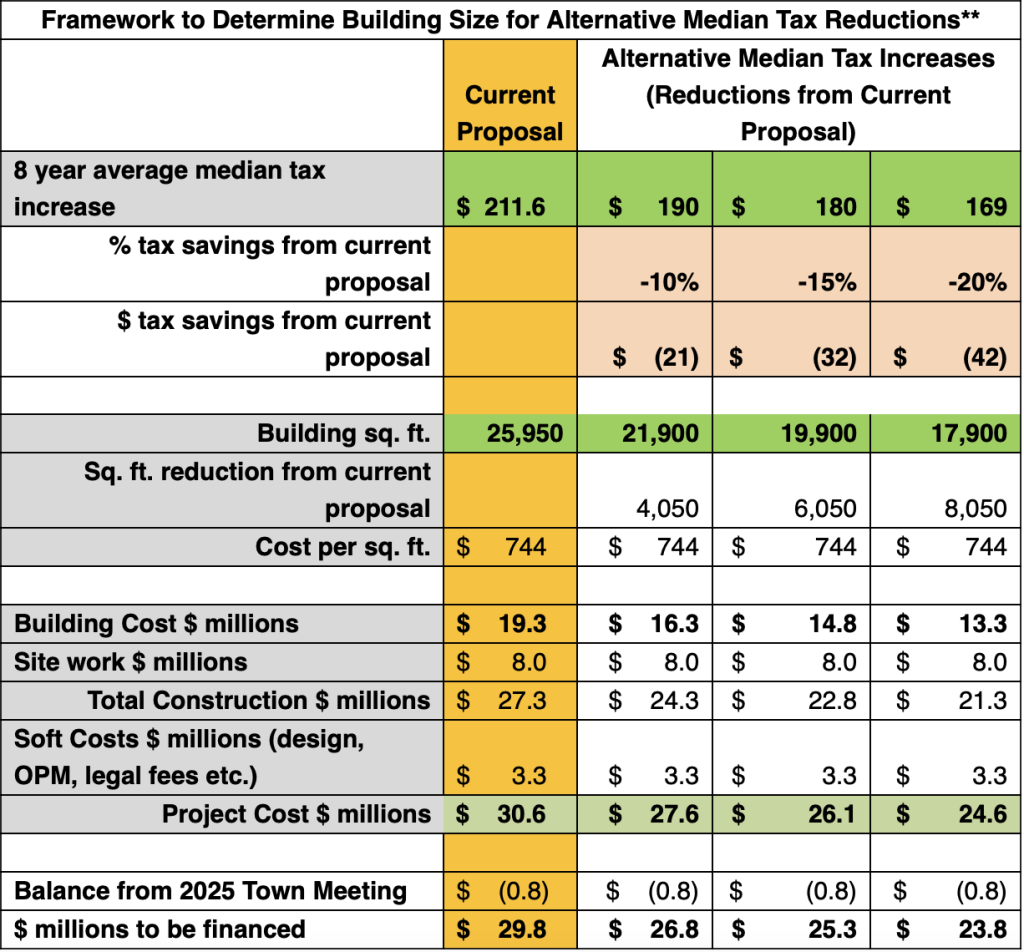 This is an important question. Reducing the building size would require a major redesign, updating bid documents, and receiving new vendor bids. The redesign would not be completed in time for the April 2026 Town Meeting resulting in a further delay and potentially increase facility construction costs. Before undertaking a redesign, the Select Board and Building Committee would need to determine if the nominal potential tax savings is worth the delay, additional design costs and potential higher constructions costs.