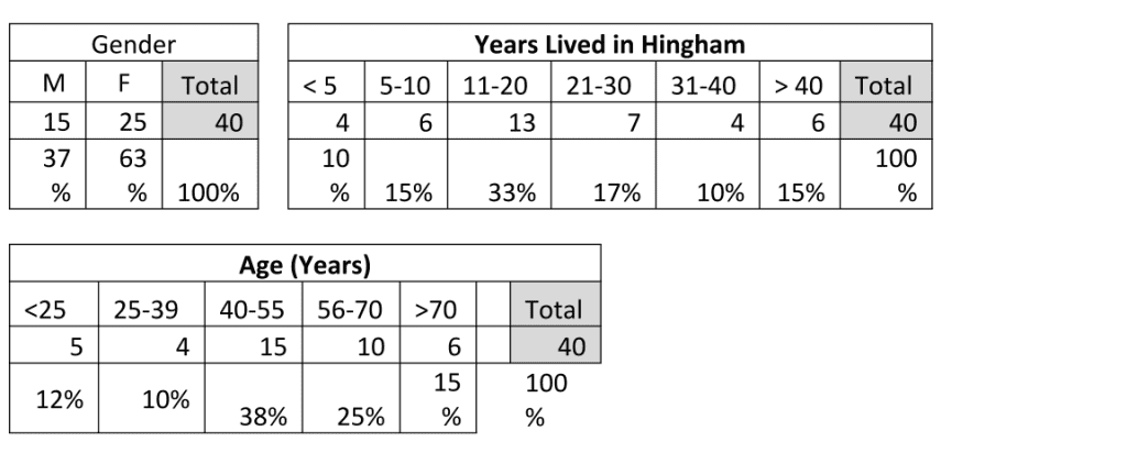 People responded to my questions over the internet or agreed to have a conversation with me in person. The data I collected was qualitative and not a scientific sample. Overall, I collected information from 40 residents – 16 people in direct interviews. Their responses represent a broad cross section of age, gender and duration living in Hingham. The age range was high school students as well as retired senior citizens. Some residents have recently moved to Hingham while others have enjoyed the town for over 40 years. Here is the profile of respondents.