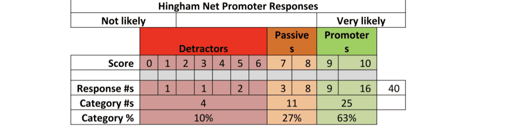 Almost two thirds (63% – 25 of the 40) of the respondents can be classified as Promoters (Score 9-10). 27% (11 of the 40) respondents can be classified as Passives (Score 7-8). Only 10% (4 of the 40) respondents can be classified as Detractors (Score 0-6).
