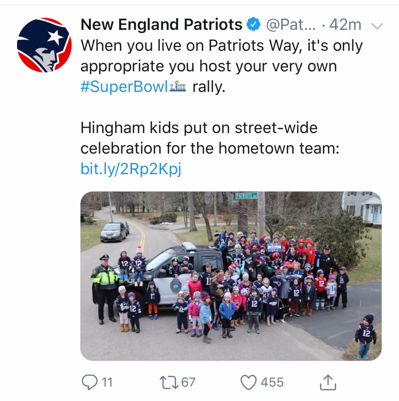 In 2019, the Patriots tweeted a photo of the kids on their official Twitter account, and Patriots wide receiver Julian Edelman even “liked” the photo, causing a flurry of excitement amidst the kids of Liberty Pole.