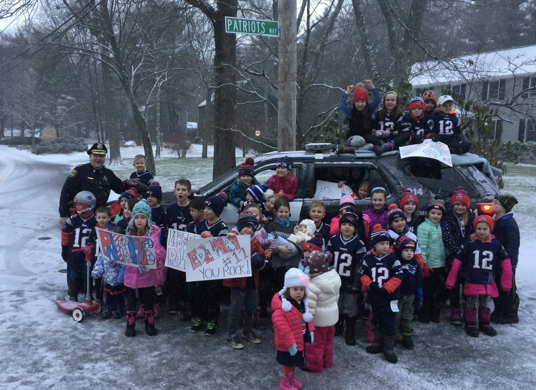 Kids in Hingham’s Liberty Pole neighborhood gathered on Patriots Way today to cheer on the Patriots as they head to the Superbowl, and carry on their special tradition of a photo in front of the legendary street sign. Chants of “Warriors”, “I love Drake Maye”, and “Go Patriots!” echoed through the neighborhood as the kids braved the cold to show support for their favorite team.